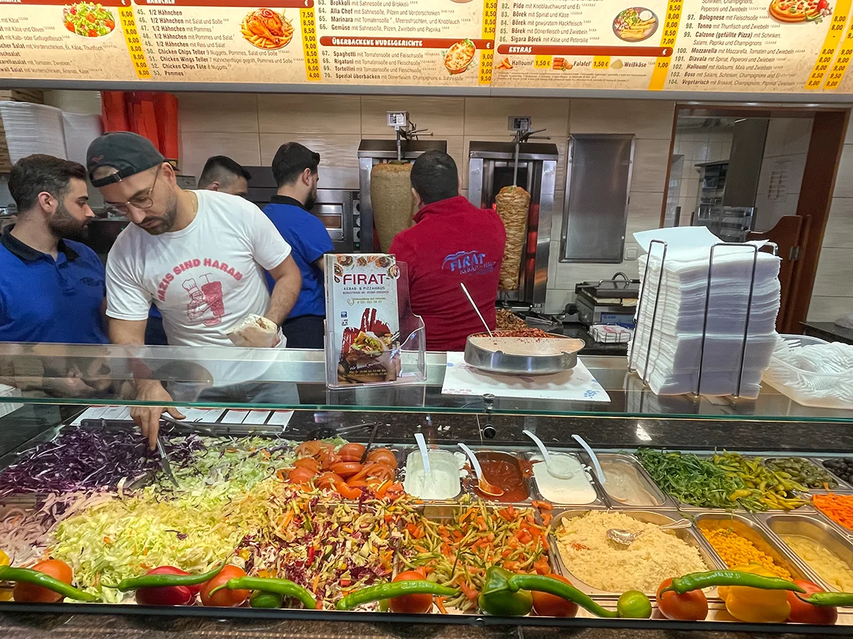 Непримечательная (хоть и с симпатичной террасой за живой изгородью) дрезденская кебабная к полудню 18 февраля начинает притягивать посетителей. Отвернулся покурить, а в очереди уже, наверное, человек 70.