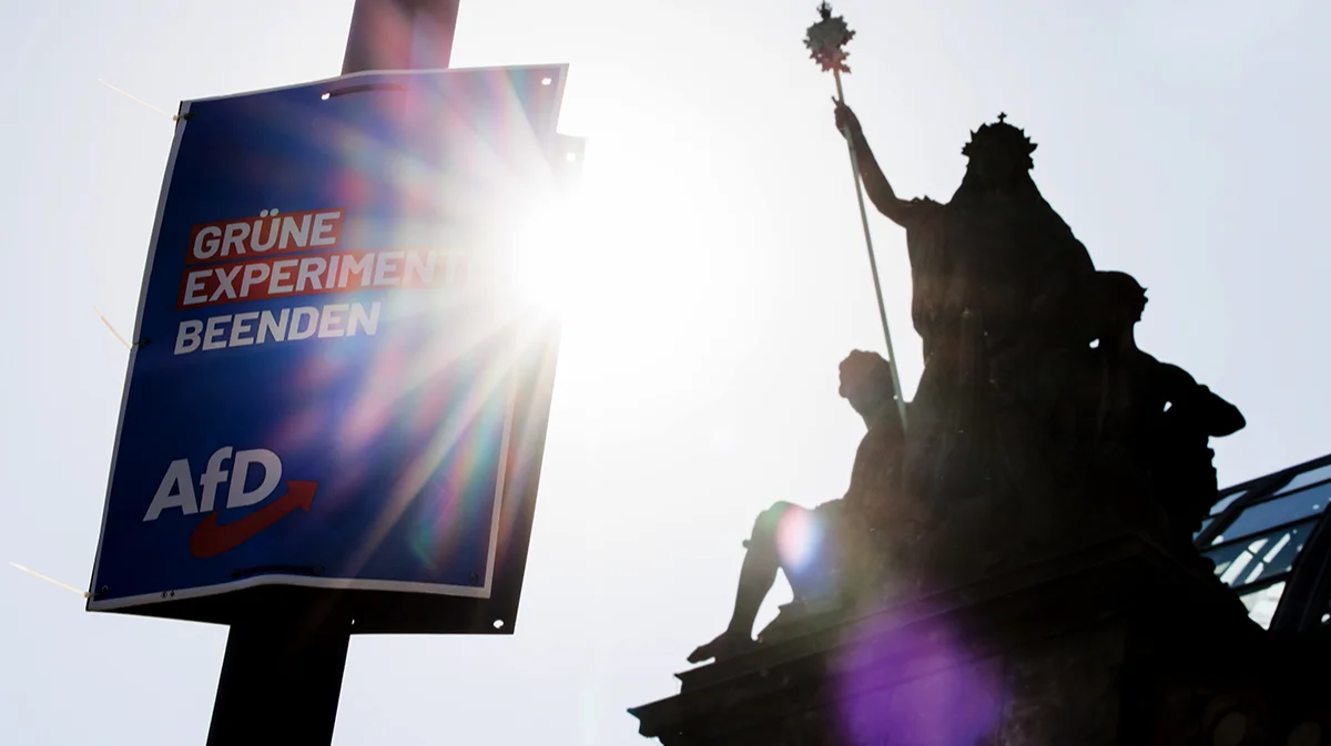 Предвыборный плакат ультраправой партии «Альтернатива для Германии» (AfD) с надписью «Конец экспериментам зеленых» перед железнодорожным вокзалом в Дрездене, Германия, 13 августа 2024 года. Фото: Clemens Bilan / EPA-EFE