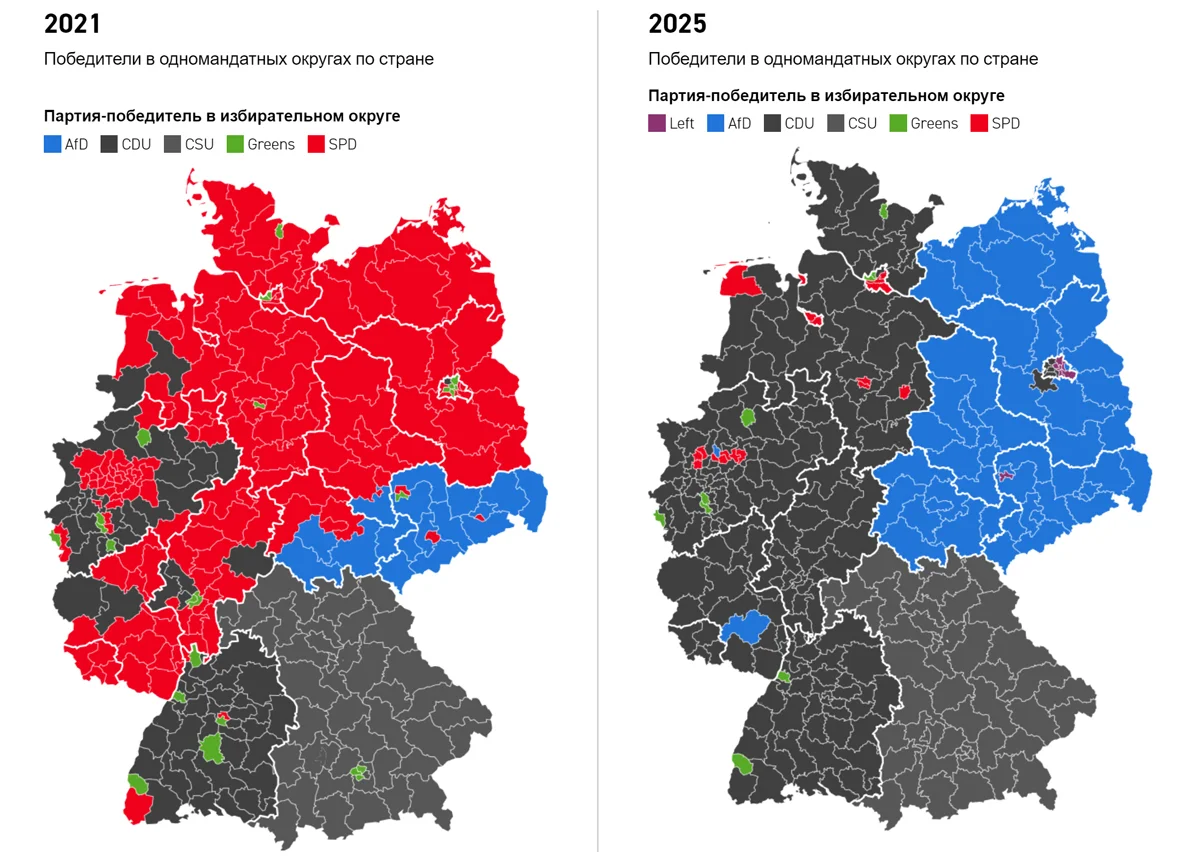 Результаты выборов 23 февраля 2025 года соответствуют большинству прогнозов накануне: после провала 2021 года христианские демократы возвращаются во власть. CDU/СSU во главе с Мерцем получил почти на 3 миллиона голосов больше, чем на прошлых выборах. И даже больше, чем был результат партии при Меркель в 2013 году.
