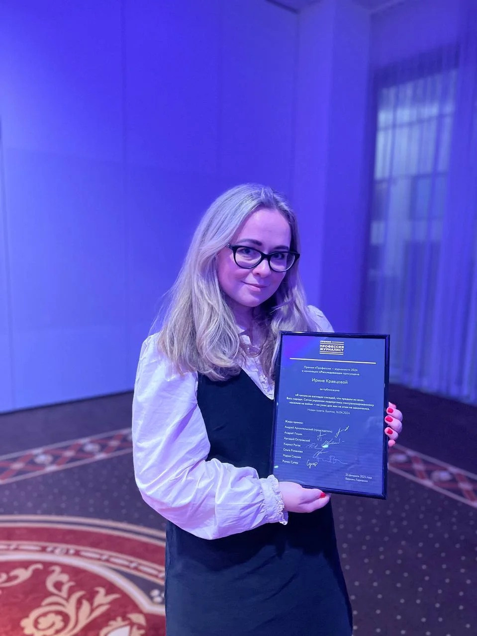 Спецкор «Новой газеты Европа» Ирина Кравцова стала лауреатом премии «Профессия — журналист» 2024 года в номинации «Расследование». Победители были объявлены на церемонии награждения.