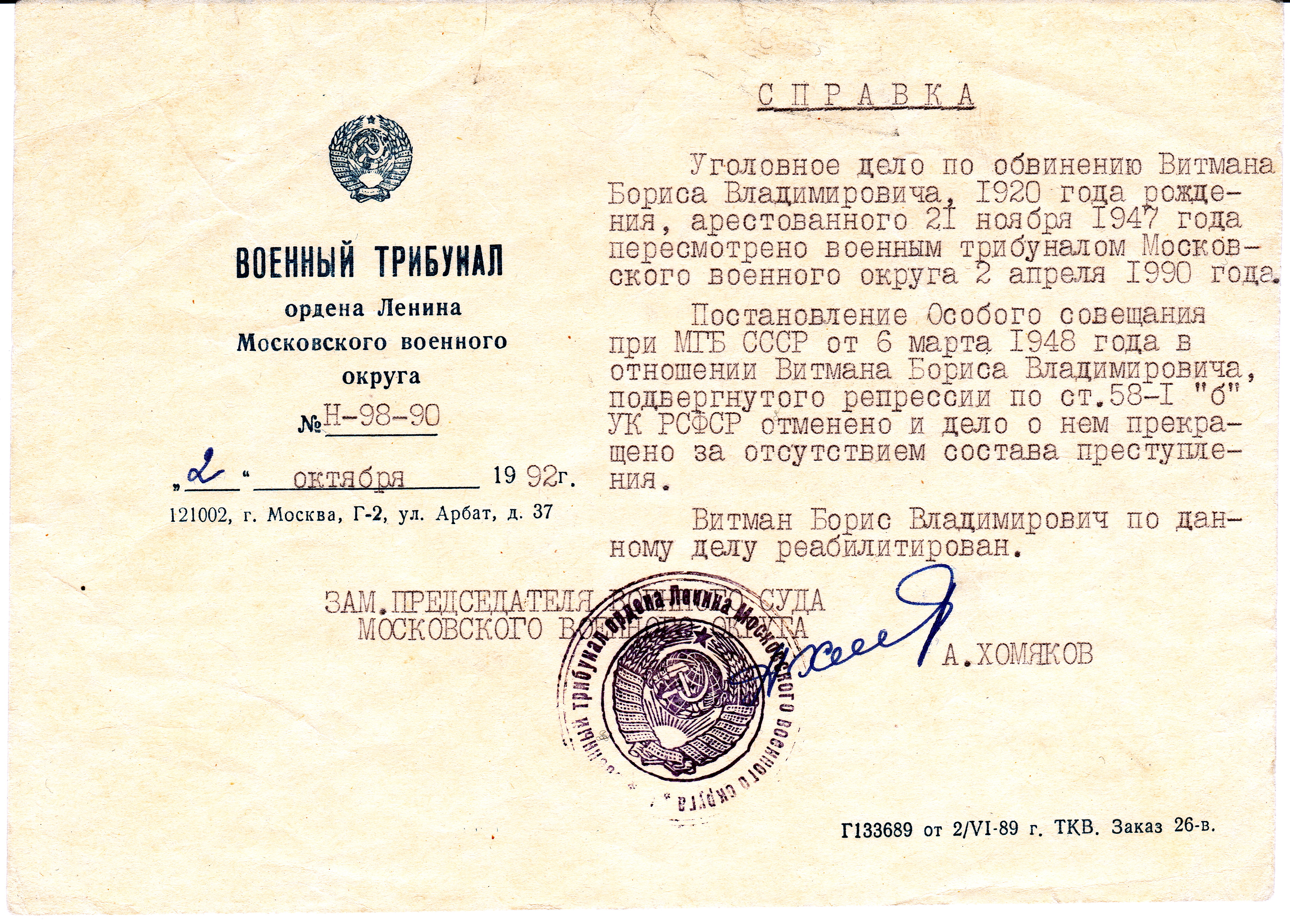 Вскоре вызывают и приговоренного по 58-й статье к 10 годам лагерей Бориса Витмана. Дают бумагу, ручку и говорят: напиши всего три слова: "Прошу меня помиловать", поставь подпись – и можно готовиться лететь домой.
