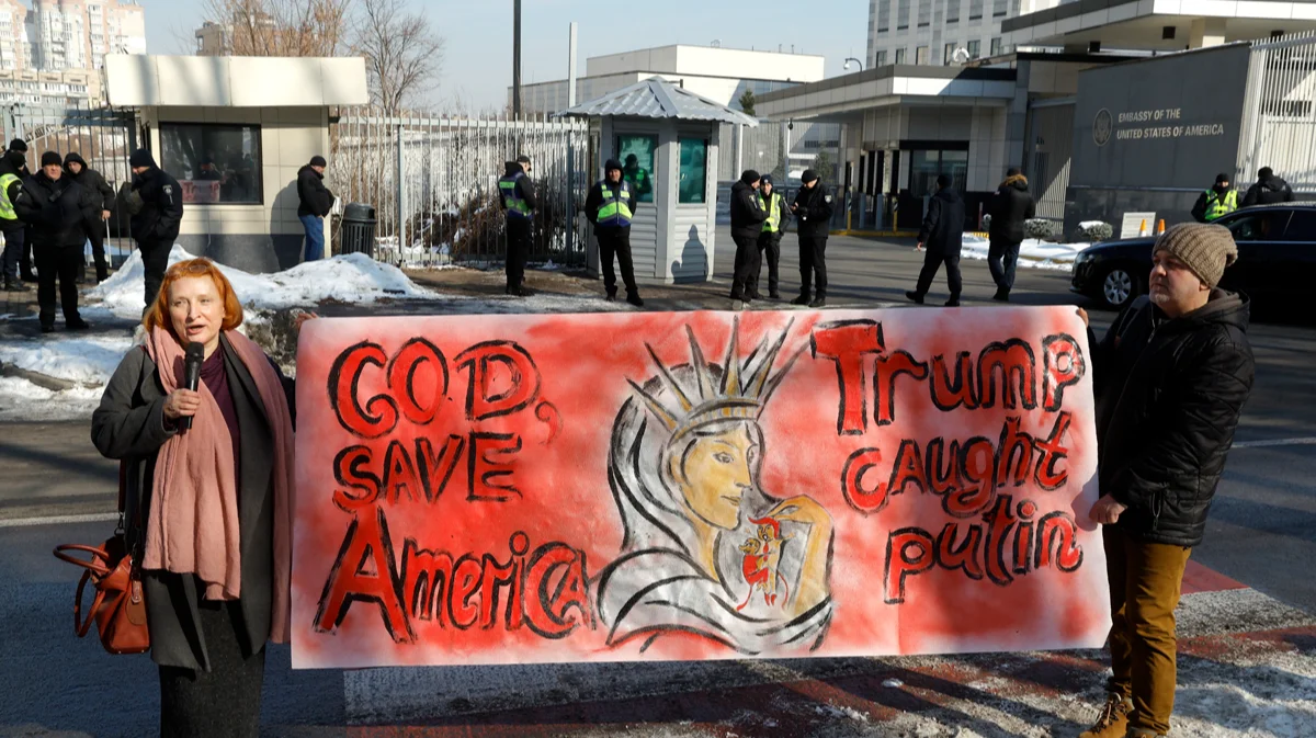 Участники акции против возможного соглашения Украины и США о добыче редкоземельных металлов напротив посольства США в Киеве, Украина, 26 февраля 2025 года. Фото: Sergey Dolzhenko / EPA