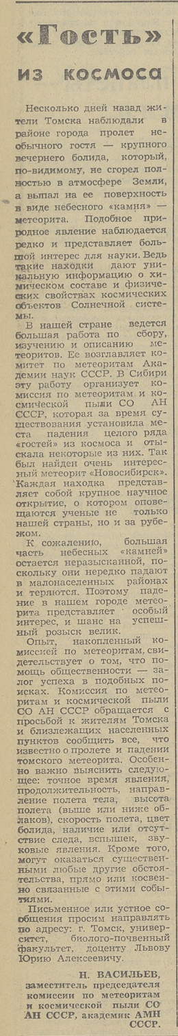 Но, в любом случае, скрыть от народа такое событие не могло даже КГБ. Слухи передавались разные, поэтому было решено проинформировать общественность. Томская газета "Красное знамя" посвятило "пришельцу" заметку на последней странице: "Несколько дней назад жители Томска наблюдали в районе пролет необычного гостя – крупного вечернего болида, который по-видимому не сгорел полностью в атмосфере Земли, а выпал на её поверхность в виде небесного камня – метеорита. Подобное природное явление наблюдается редко и представляет большой интерес для науки", сообщала газета.