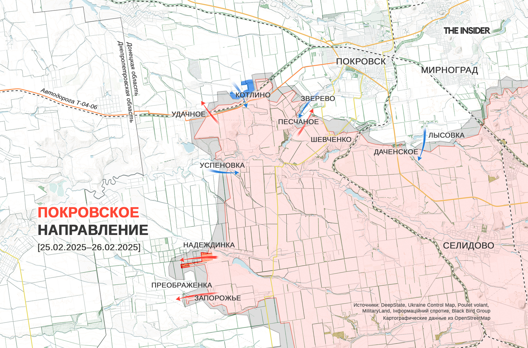 На покровском направлении заявляется о зачистке ВСУ Котлина (до 2016 года — Димитрово) к западу от Покровска (до 2016 года — Красноармейск).