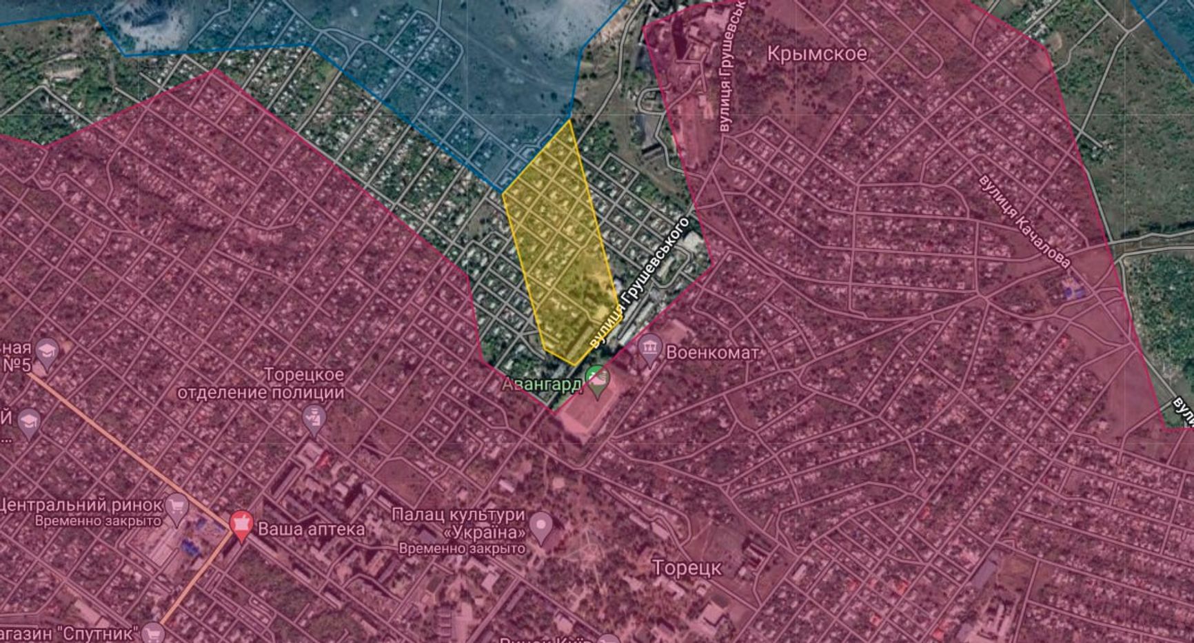 С российской стороны выложено видео с боем в Торецке. Пророссийский OSINT-ресурс «Сливочный каприз» геолоцирует продвижение подразделений ВСУ на глубину до 700 метров в оборонительные порядки ВС РФ в городской черте со стороны Крымского.