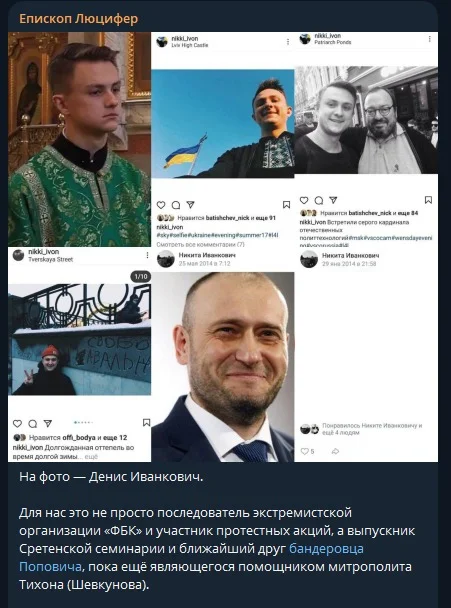 В октябре 2022 года «Епископ Люцифер» заметил второго героя нашей истории — Никиту Иванковича, не особо отличая его от первого (обоих он окрестил Денисами). Суть доноса на него состояла в том, что Иванкович якобы «последователь экстремистской организации «ФБК»** и участник протестных акций», а свою духовно-политическую формацию получил в той же Сретенской семинарии, где и Попович.