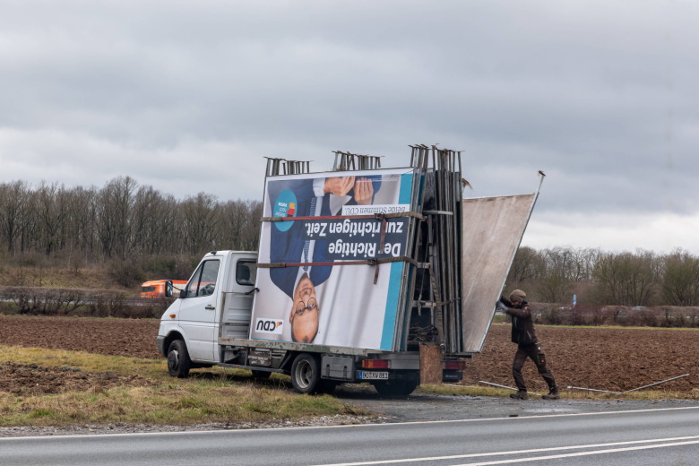 Лимбург (Эссен), 26 февраля 2025 года. Рабочие демонтируют стенды с партийной предвыборной агитацией