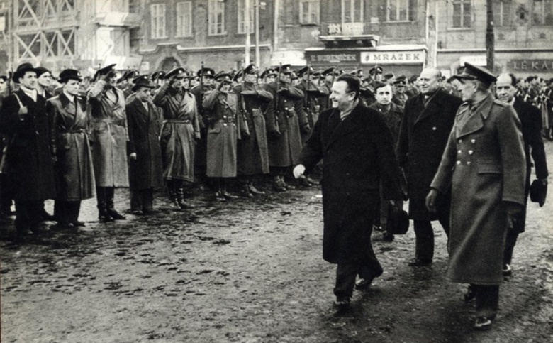 Довольный лидер чешских коммунистов Клемент Готвальд проходит мимо строя сотрудников StB и Народного ополчения, февраль 1948 года. Он уже победил