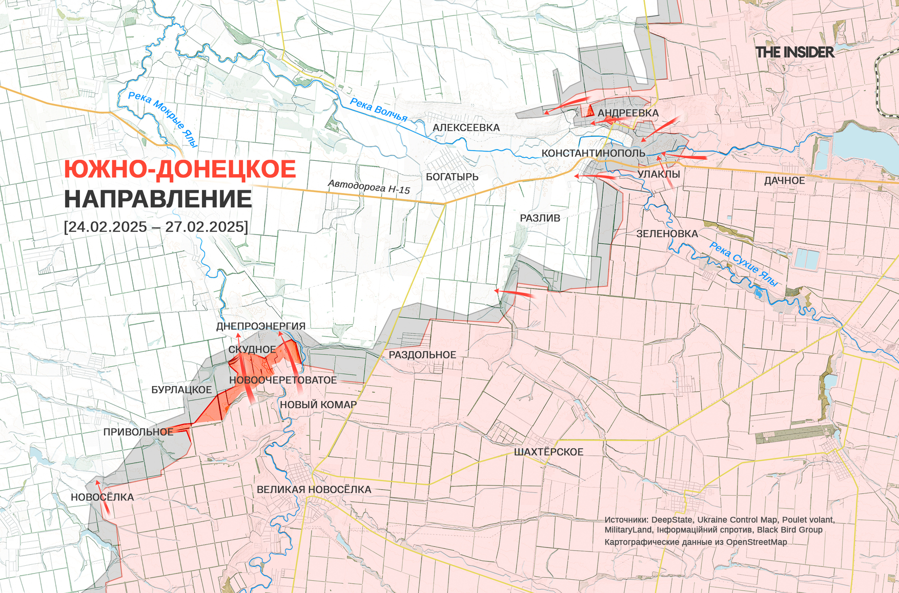 DeepState сообщает о расширении зоны контроля ВС РФ около Бурлацкого и в Андреевке. «Военкор» Юрий Котенок жалуется, что закрепиться на новых позициях не получается, поскольку «очень мешают дроны». Также Котенок пишет о боях в западной части Константинополя и приближении на одну «посадку» ближе к Разливу.