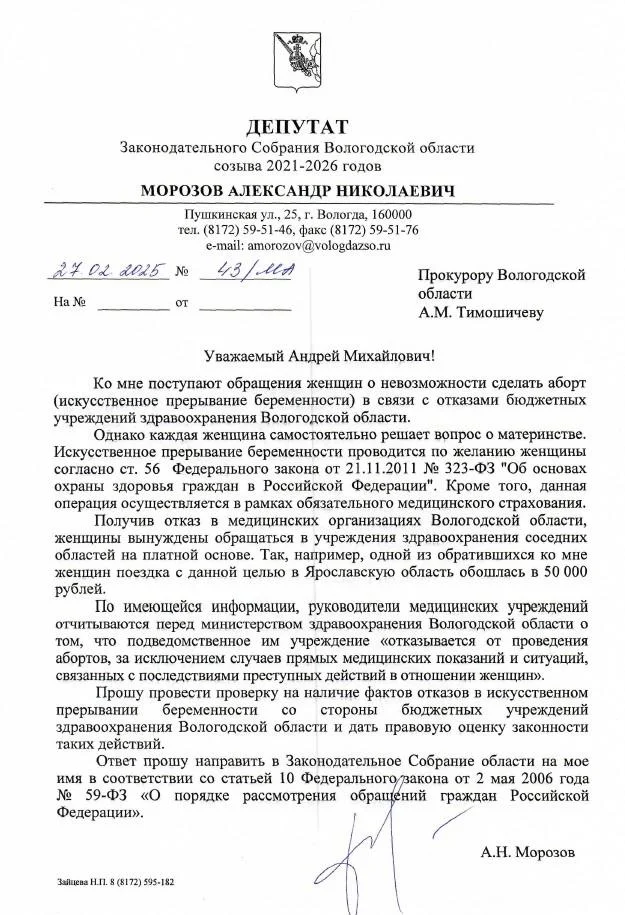 К депутату от КПРФ Александру Морозову обратились три вологжанки, которым местные больницы отказались сделать аборт. Внимание на это обратило 7x7.