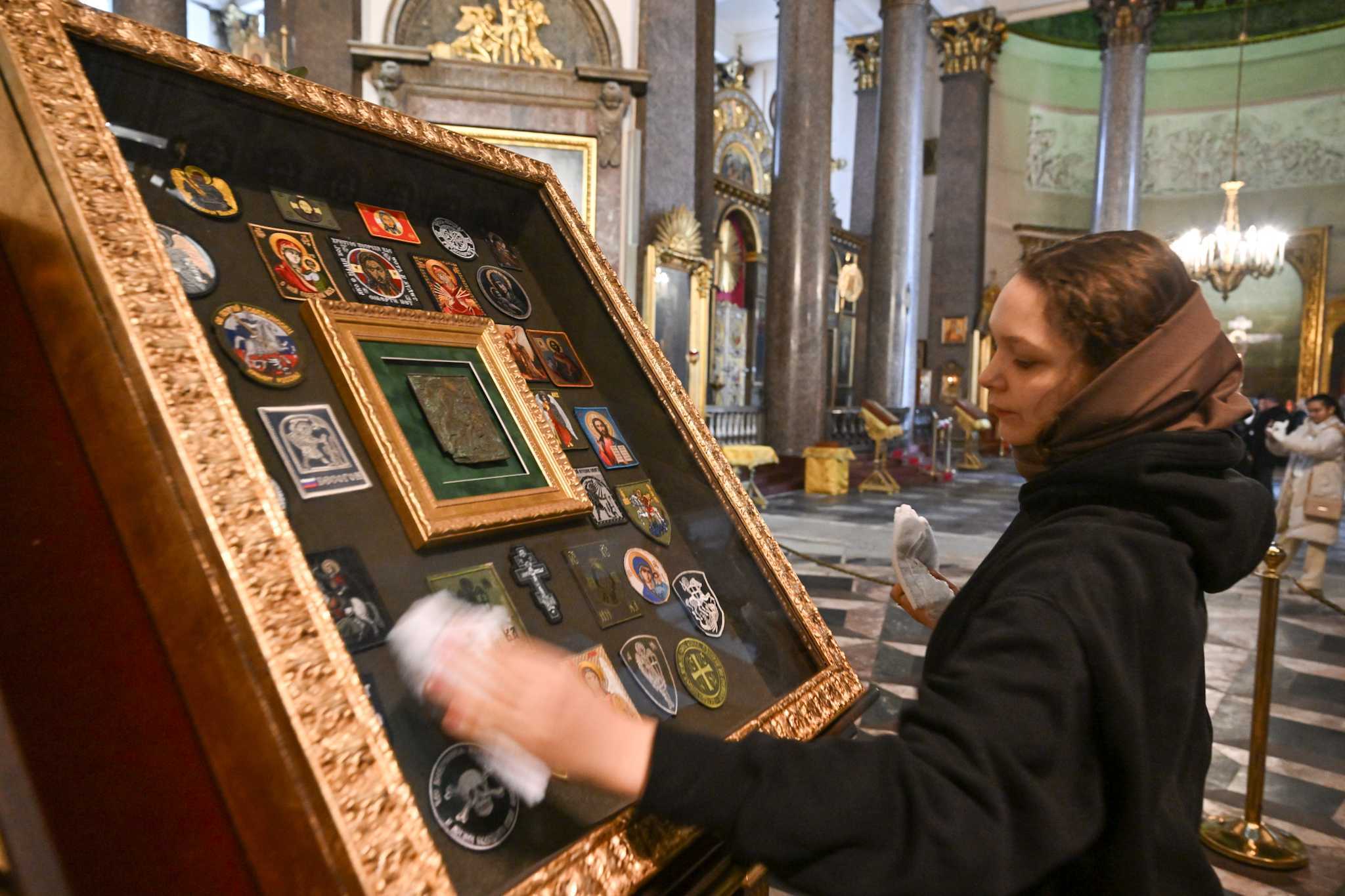 В Казанский собор в тот же день привезли «милитари-киот». Икону XIX века, якобы найденную под Сталинградом в годы Великой Отечественной войны, окружили патчами участников войны в Украине «околорелигиозной тематики».