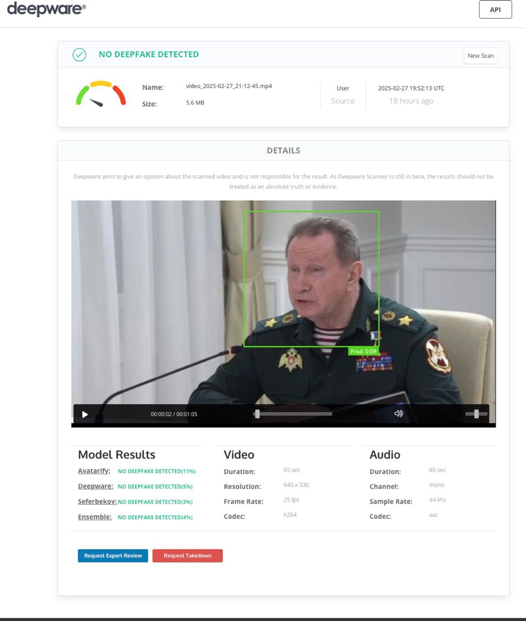 Дагестанские Telegram-каналы, связанные с силовиками, распространяют видео (1, 2), на котором глава Росгвардии, генерал армии Виктор Золотов выражает недовольство главе Дагестана Сергею Меликову за то, что во время российско-украинской войны он не оказал помощи подразделениям Росгвардии, в частности, Отдельной дивизии оперативного назначения, командиром которой когда-то был Меликов. В том же видео Золотов похвалил за помощь Росгвардии главу Чечни Рамзана Кадырова. При этом видео не было ни в одном официальном канале и никаких официальных заявлений Росгвардия по этому поводу не сделала. Deepware Scanner и другие сервисы по проверке видео на подлинность не обнаружили в ролике признаков дипфейка.