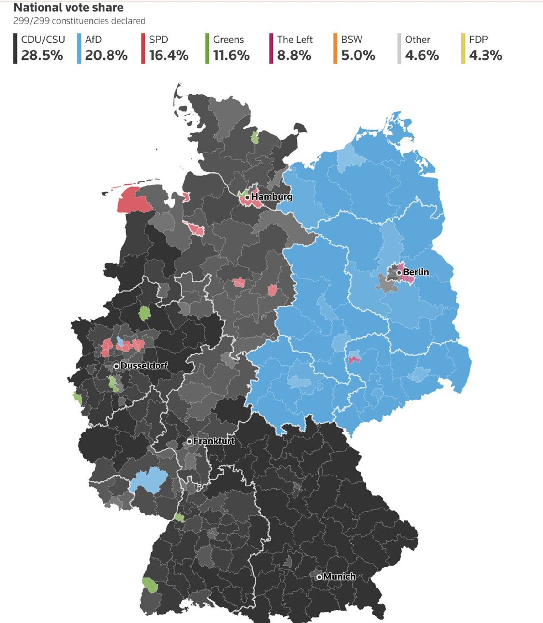 И если итоги выборов в пандемийном 2021 году, ознаменовавшиеся также уходом Ангелы Меркель из большой политики, стали некоторым отходом от радикализма («Альтернатива» ухудшила свой результат до 10,3%, а «Левые» прошли в парламент лишь благодаря победе в минимальном количестве одномандатных округов), то 2024-й (выборы в Европарламент и в трех восточногерманских землях, закончившиеся успехом АдГ) и 2025-й продемонстрировали со всей однозначностью: в германском обществе раскол.