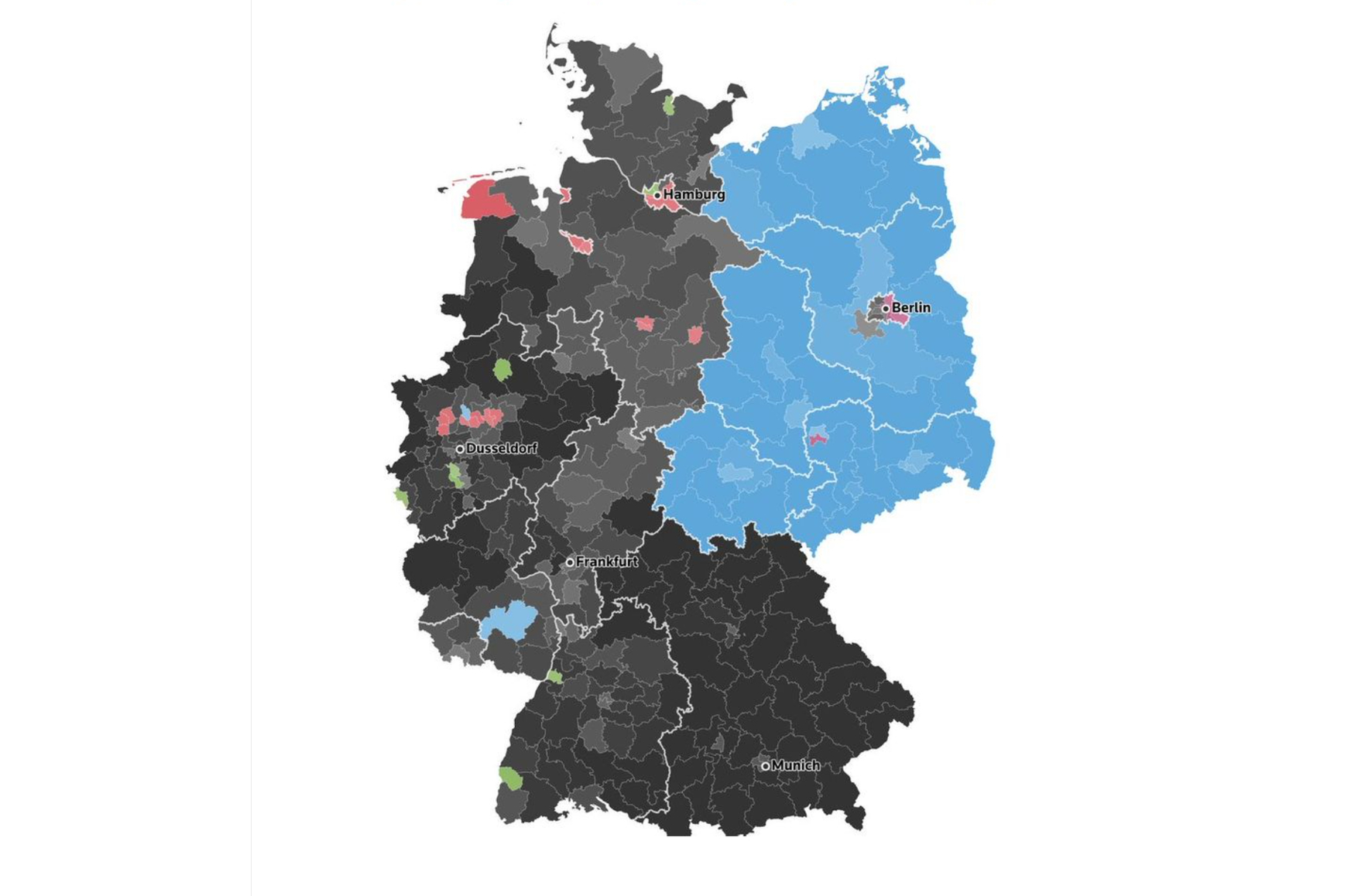 Также тревожным для «традиционных» партий показателем стал тот факт, что более трети из почти 3,7 млн немцев, бойкотировавших прошлые выборы, в этот раз пришли на участки и выбрали именно АдГ. Теперь электоральная карта Германии почти однотонно окрашена в два партийных цвета — черный на западе (ХДС и ХСС в Баварии) и голубой на востоке (АдГ). Водораздел проходит аккурат по линии бывшей германо-германской границы до 1990 года.
