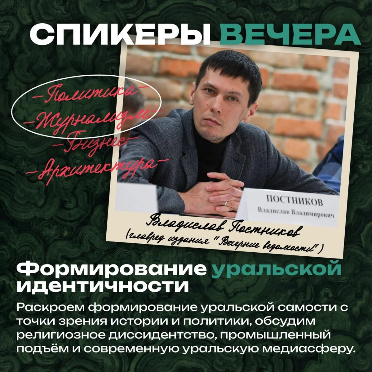 На вечере, где обсуждали уральский конструктивизм, уникальный парфюм, опыт уральских предпринимателей по построению успешного бизнеса, Владислав Постников должен был прочитать лекцию «Формирование уральской идентичности». «В лекционном формате раскроем формирование уральской самости с точки зрения истории и политики, обсудим религиозное диссидентство, промышленный подъем и современную уральскую медиасферу», — объяснили тему организаторы.