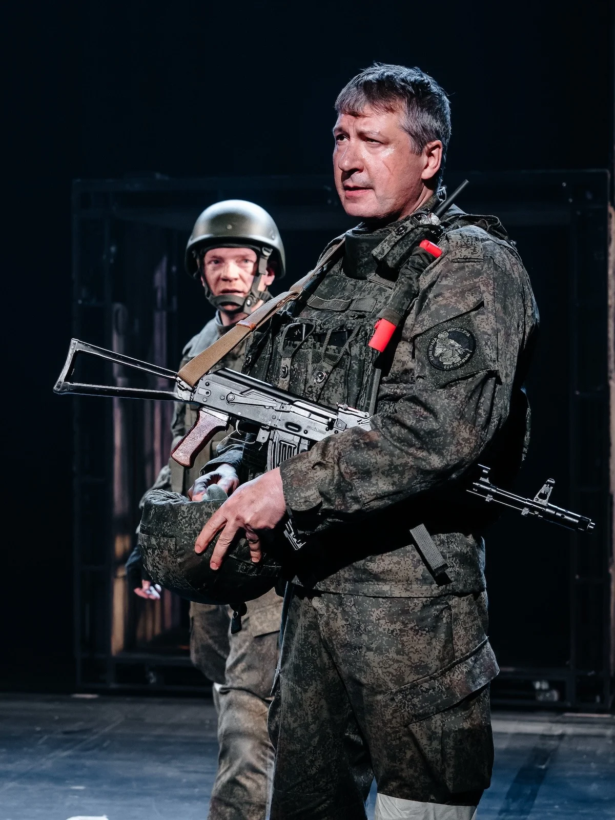 В одном из боев Артема ранит в ногу, и на себе его выносит сослуживец. «Брось меня», — говорит Артем товарищу. «Ни хераааа! Ни херааааа!!!» — слышит он в ответ. И все это выглядит до предела неестественно. Нет, никто не отрицает человечность и подвиг. Но вряд ли они в моменте совершаются так патетично — а тут как в геройском кино. Кстати, бои в спектакле показаны тоже как в боевиках: сцену заливает красный свет, резко и гулко звучат выстрелы, летят искры, в движение приходят двухуровневые фурки, бегают солдаты… Таких сцен в спектакле несколько.