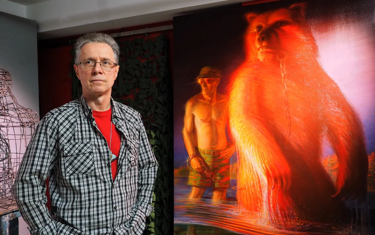 Вадим Григорьев-Башун на фоне своей картины «Купание красного медведя» в музее «Эрарта», 1 апреля 2023 года. Фото: Александр Чиженок / Коммерсантъ / Sipa USA / Vida Press