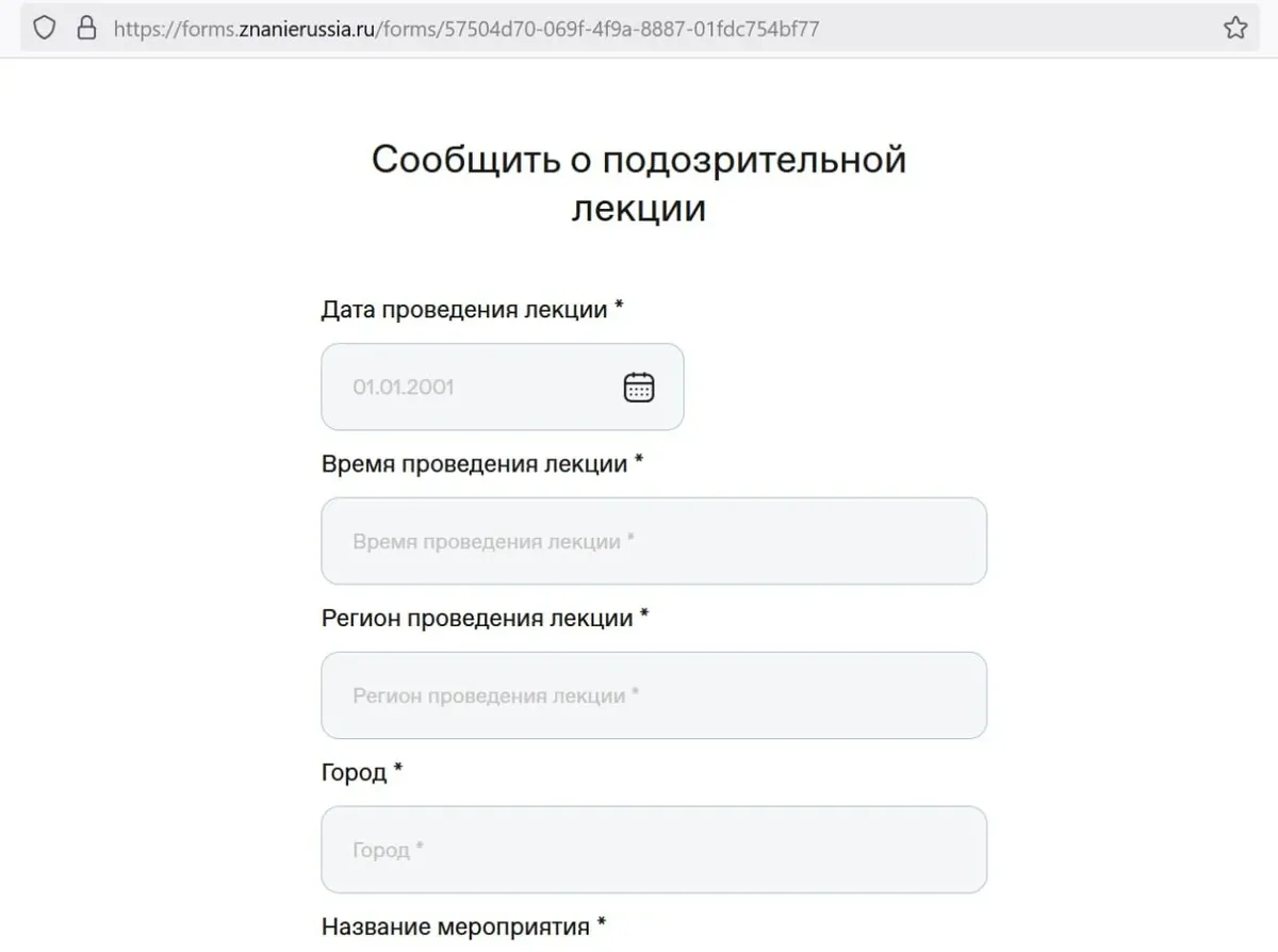 В этой форме пользователям предлагается указать дату и время проведения лекции, регион и место встречи, а также ее название и имя спикера. В комментариях пользователь может указать, что «конкретно вызвало подозрение».