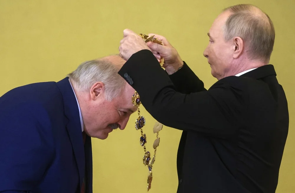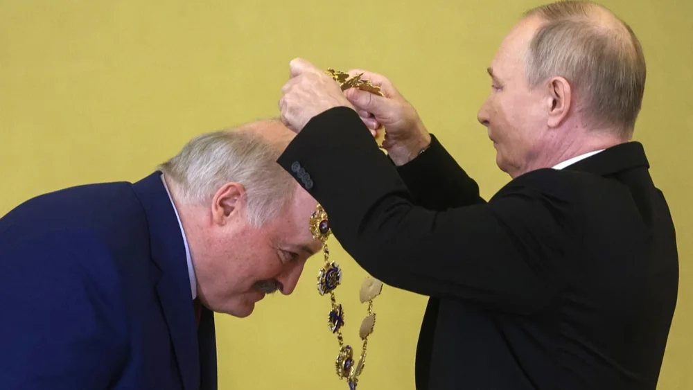 Vladimir Putin awards Alexander Lukashenko with the Order of St. Andrew the Apostle the First-Called, Russia’s highest state award, during their meeting at the Kremlin in Moscow, 9 October 2024. Photo: EPA-EFE/SERGEI ILNITSKY