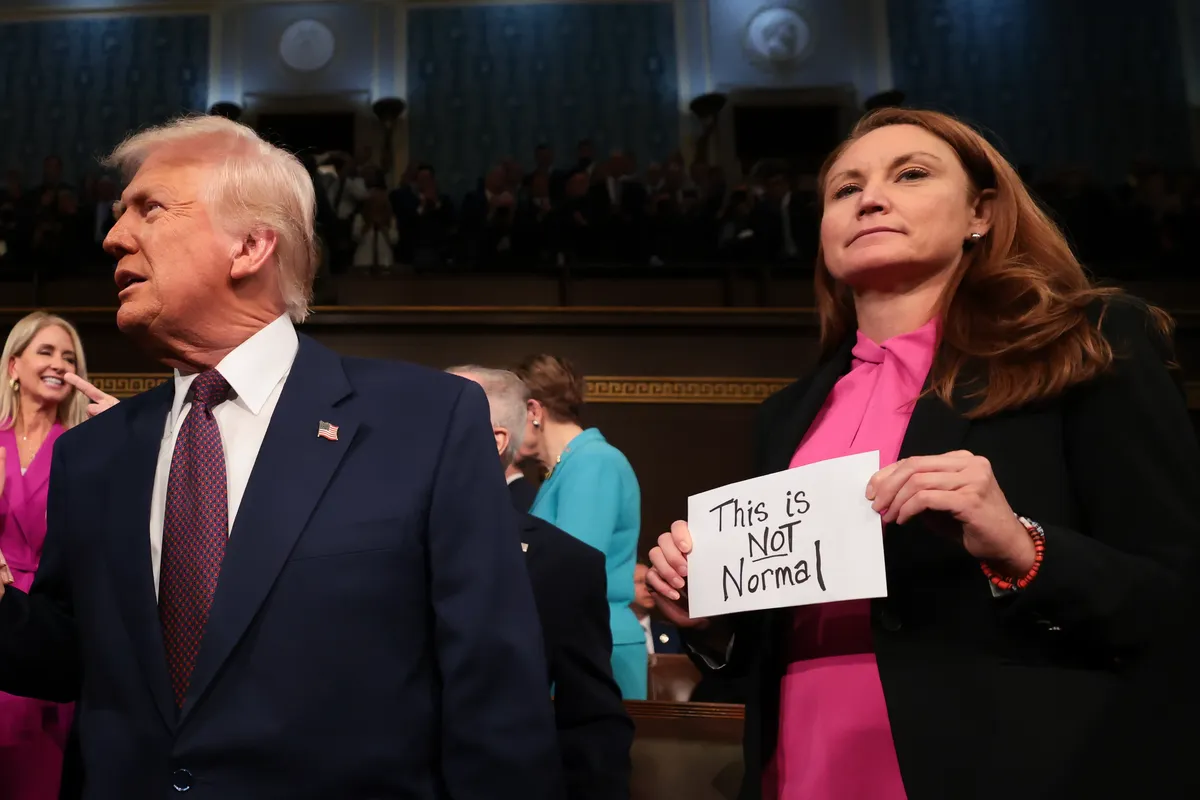 Почти каждое заявление Трампа сопровождалось стоячими овациями республиканцев. Демократы сидели молча, не вставая с мест. В их руках были таблички «Илон ворует», «Спасите MEDICAID», «Защитите ветеранов».