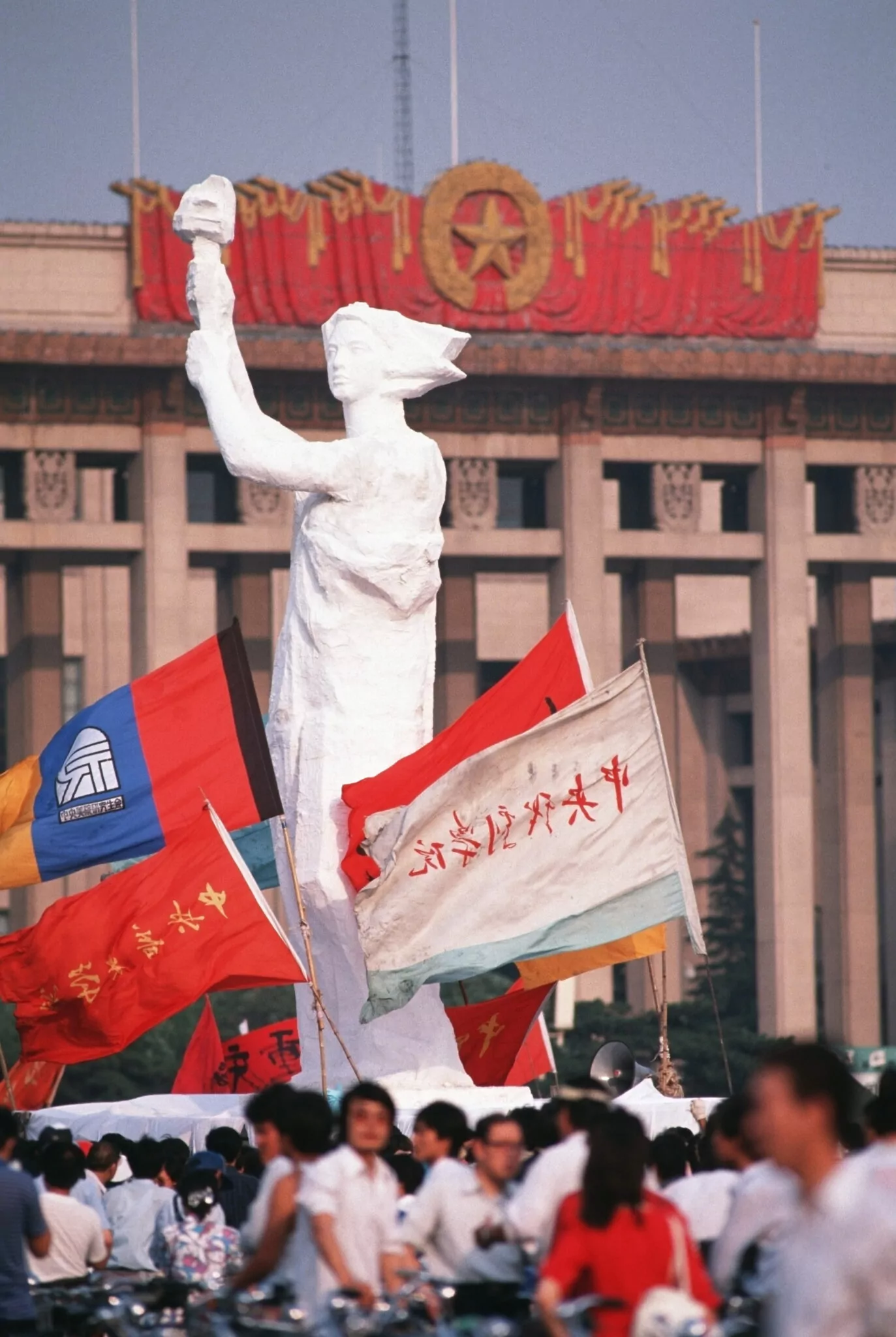 30 мая на площади Тяньаньмэнь появился один из главных символов протеста — 10-метровая статуя «Богиня Демократии», созданная студентами художественных вузов из папье-маше. Чтобы сбить с толку правоохранителей, активисты заранее сливали ложные маршруты ее перевозки, а доставили конструкцию ночью, частями. Она вдохновила уставших протестующих на продолжение борьбы — если 29 мая на площади было около 10 тысяч человек, то после установки «Богини Демократии» 30–31 мая там собралось уже до 300 тысяч митингующих и зрителей.