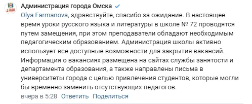 В школе №72 Омска русский и литературу семиклассникам уже месяц преподает физрук, рассказали родители школьников губернатору Виталию Хоценко на его странице «Вконтакте» — под постом, где Хоценко напоминает, что Омск — «молодежная столица России». Внимание на комментарий обратило местное издание «Город55».