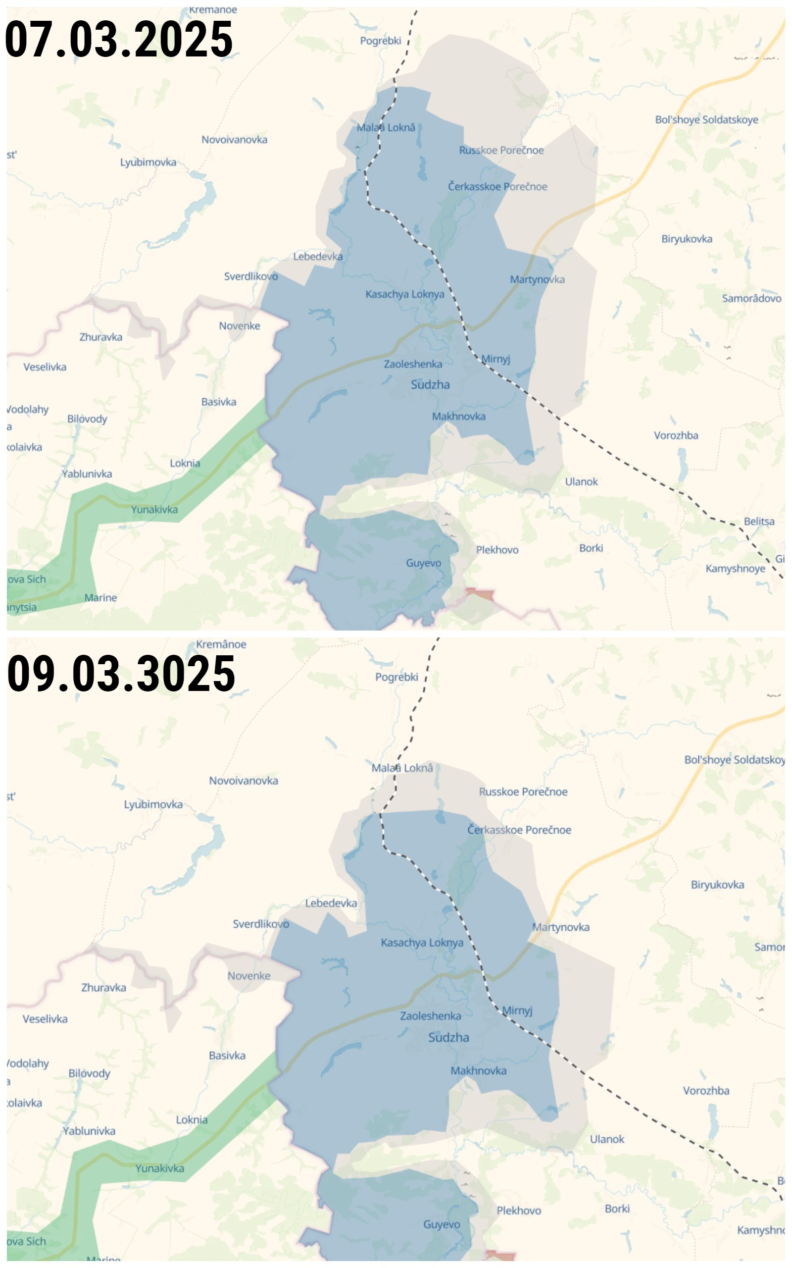 9 марта российские "военкоры" отчитались о захвате Малой Локни, Мартыновки, Михайловки, Косицы, Черкасского Поречного, Кубаткина, Мирного, Махновки и Казаьчей Локни (населённые пункты, отмеченные оранжевым цветом). DeepState, в свою очередь, подтвердил потерю Лебедевки (фиолетовый цвет), Старой Сорочины, Викторовки, Николаевки, Малой Локни, Косицы, Черкасского Поречного и Мартыновки (населённые пункты, отмеченные голубым цветом). DeepState также подтвердил продвижение ВС РФ по территории Украины в районе Новенького.