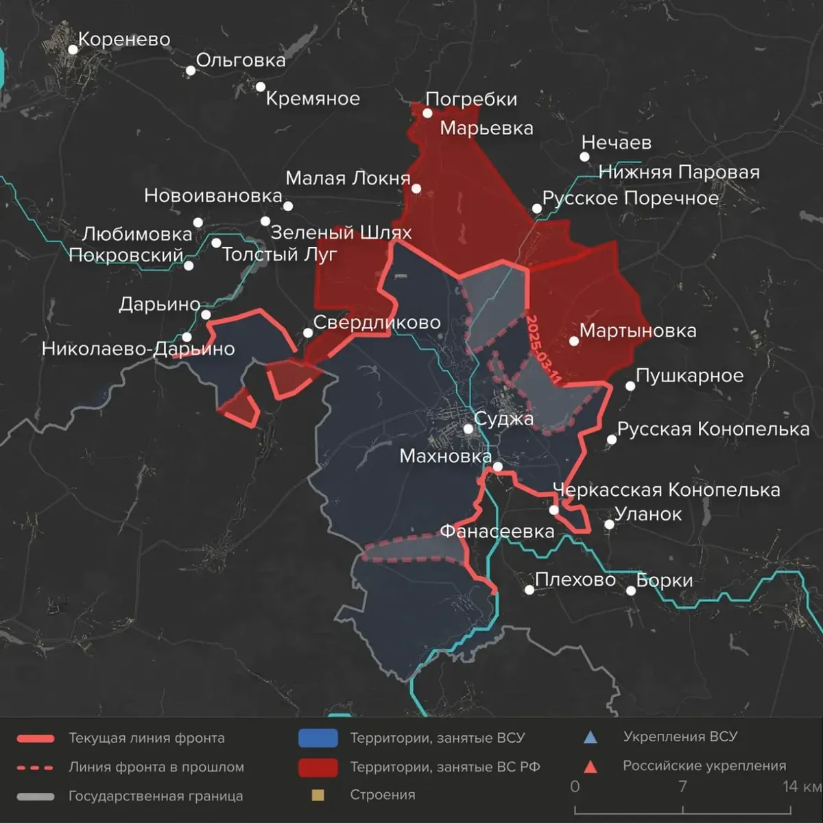 Под контролем ВСУ после мощной российской атаки, начавшейся 8 марта, остаются только сам город Суджа и его окраины.