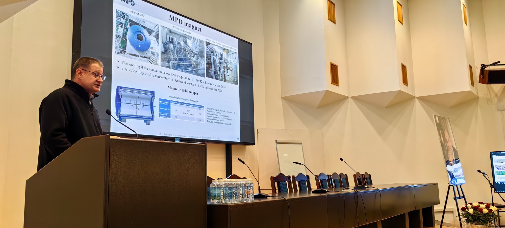 Виктор Рябов (НИЦ «Курчатовский институт» — ПИЯФ, ОИЯИ) представил обширный доклад об экспериментальной программе на комплексе NICA. Он сообщил об успешном завершении первого физического цикла эксперимента BM@N (Барионная материя на «Нуклотроне»), в ходе которого было зарегистрировано более 500 млн событий столкновений ядер ксенона с мишенью из йодида цезия. Докладчик рассказал также о подготовке к запуску детектора MPD (Multi-Purpose Detector), намеченному на конец 2025 года, и о разработке эксперимента SPD (Spin Physics Detector) для изучения спиновой структуры нуклона с использованием поляризованных пучков протонов и ядер дейтерия.