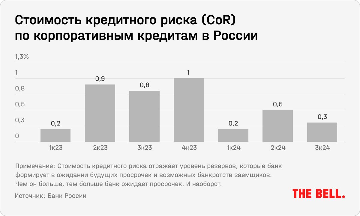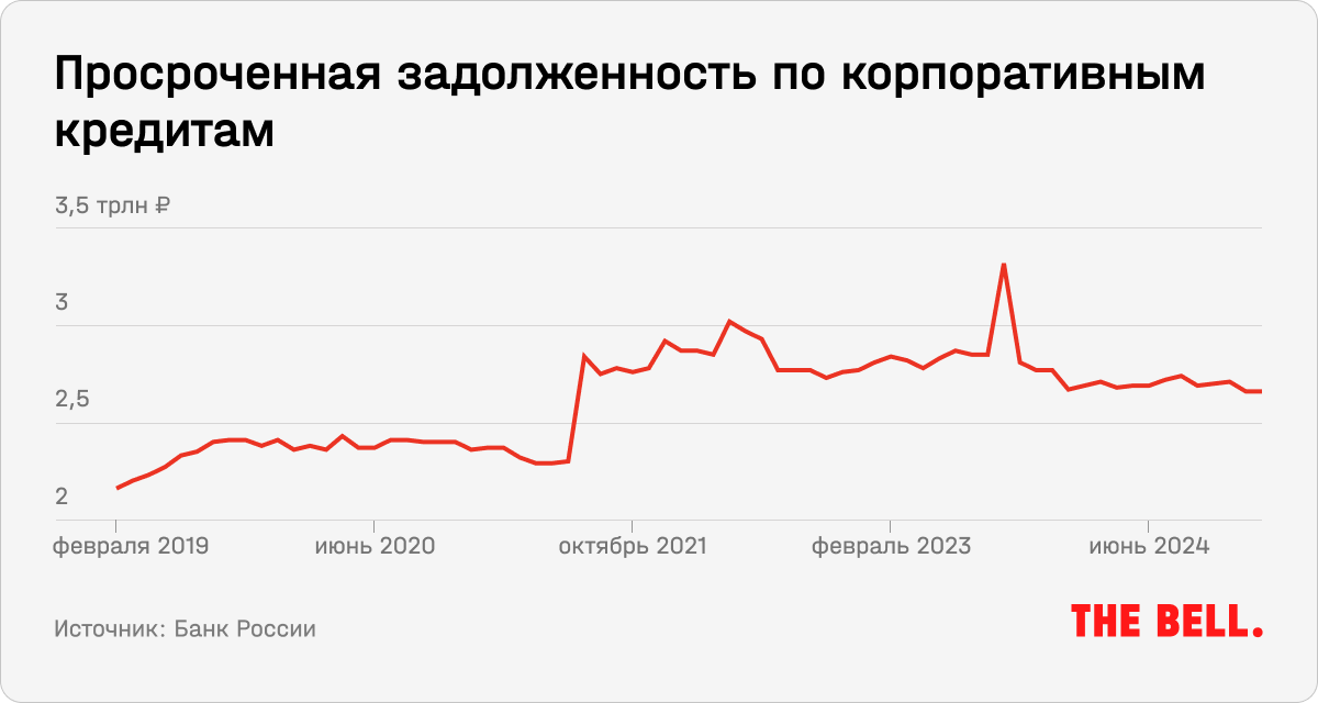 Формально у банков нет оснований для пессимизма — просроченная задолженность по корпоративным кредитам остается (.xlsx) на рекордно низком с середины 2021 года уровне — 2,7 трлн рублей. Правда, при быстром росте кредитного портфеля проблемы по новым долгам становятся заметны не сразу, потому что их «вызревание» занимает некоторое время, объясняет собеседник The Bell из крупного брокера. «Но даже с поправкой на этот эффект быстрого роста ситуация в целом по экономике пока не предполагает каких-то алармистских прогнозов», — успокаивает он.