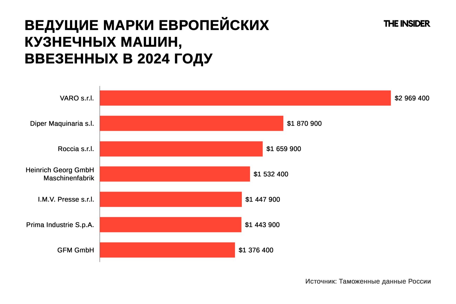 The Insider направил запросы в компании Varo S.R.L., Diper Maquinaria S.L., Roccia S.R.L., Heinrich Georg GmbH Maschinenfabrik, I.M.V. Presse S.R.L., Prima Industrie S.P.A., GFM GmbH, Faccin S.P.A., Salvagnini, Prima Industrie, Lasco Umformtechnik, Presstrade AG.