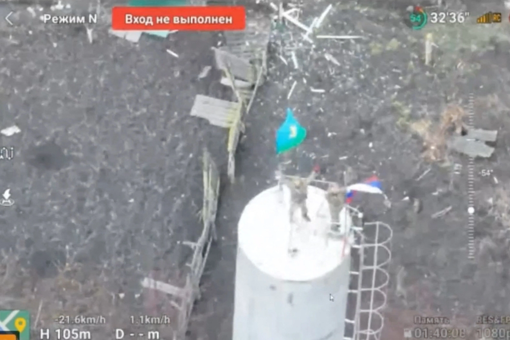 Фото: Съёмка с дрона, на которой видной военнослужащих, устанавливающих российский триколор на водонапорной башне в Судже. Видео снято 12 марта 2025 года. Social Media via REUTERS
