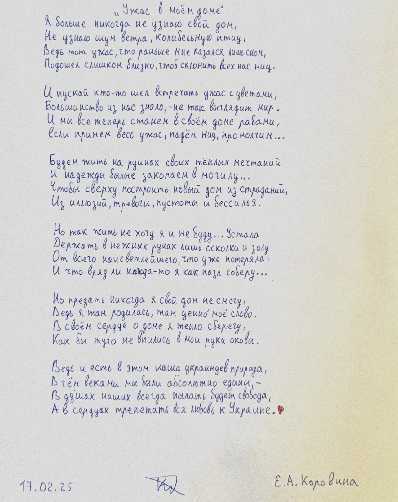 One of her passions was poetry. Usually, she wrote in Ukrainian, but for the trial, she made an exception. She ended her final statement with a poem in Russian titled “Horror in My Home”.