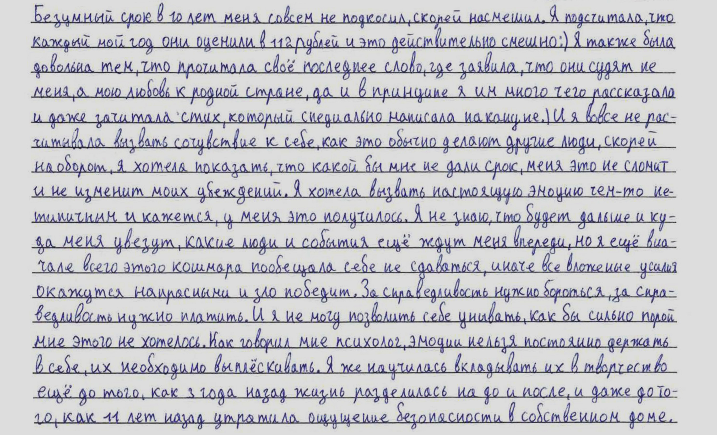 “The insane sentence of 10 years didn’t break me at all, rather it made me laugh. I calculated that they valued each of my years at 112 rubles [~$1.2], and that's truly funny :) I was also pleased that I read my final statement, where I declared that they were judging not me, but my love for my native country, and in principle, I told them a lot and even recited a poem that I had specifically written the day before. ) And I didn’t at all expect to evoke sympathy for myself, as other people usually do, but rather, on the contrary, I wanted to show that no matter what sentence they gave me, it wouldn’t break me or change my convictions. I wanted to evoke a genuine emotion with something atypical, and it seems I succeeded. I don’t know what will happen next and where they will take me, what people and events still await me ahead, but I promised myself at the very beginning of this whole nightmare not to give up, otherwise all the efforts invested will be in vain and evil will prevail. You have to fight for justice, you have to pay for justice. And I cannot allow myself to despair, no matter how much I sometimes want to. As my psychologist told me, emotions cannot be constantly kept inside, they need to be released. I learned to invest them in creativity even before life was divided into ‘before’ and ‘after’ 3 years ago, and even before I lost the feeling of security in my own home 11 years ago.”