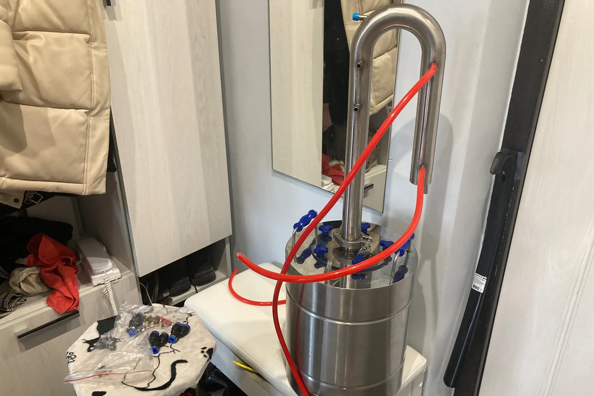 — Вот смотрите: бак на 17 литров, — объясняет он устройство «машинки». — С помощью пяти «барашков» откручиваете крышку, снимаете колонну, и вот сюда помещается 17 литров. Подключаете вот так шланги, если от раковины далеко, то подлиннее, если близко, то покороче. Это я показываю, как делать вторую перегонку. Сюда подается холодная вода, она перетекает в холодильник, выходит здесь и выливается отсюда. Можно подсоединить кран для горячего, сейчас тут заглушка. Вот сюда вставляете термометр для измерения температуры в колонне…