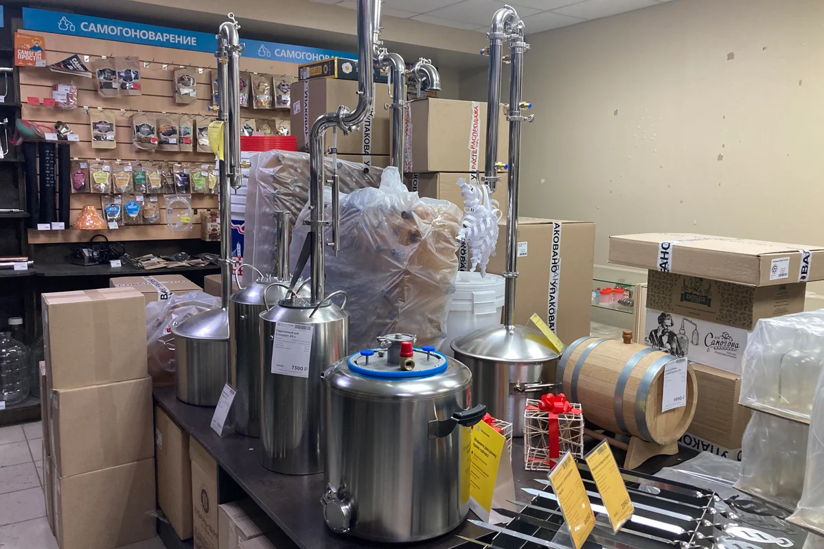 Два магазина под названием «Русская дымка» действительно предлагают высокотехнологичное оборудование не только для самогоноварения, но и для вина, пива, консервирования, то есть сразу на весь стол. И широчайший ассортимент сырья: хочешь — гони из шелухи кедрового ореха, хочешь — настаивай на копченой вишне. И это точно не для алкашей, тем достаточно взять пластиковый чан (имеется в продаже) и замутить брагу (сырье здесь же). Остальное, уверяет продавец, плотный седой дядечка в камуфляже, для настоящих гурманов. В последнее время, говорит он, особого спроса на его товар не было.