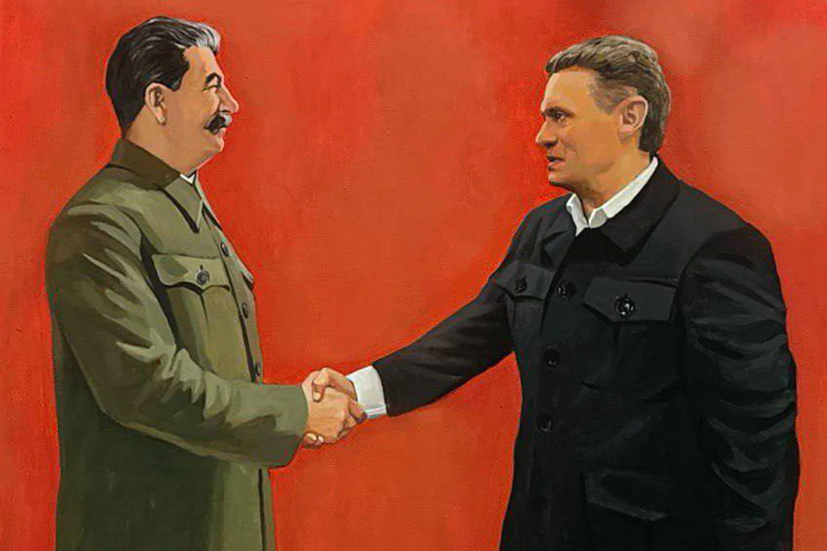 Иосиф Сталин в Вологде тоже довольно логичен, не хуже Грозного. В кабинете губернатора он представлен на одной картине с самим Филимоновым: два великих человека жмут руки друг другу.