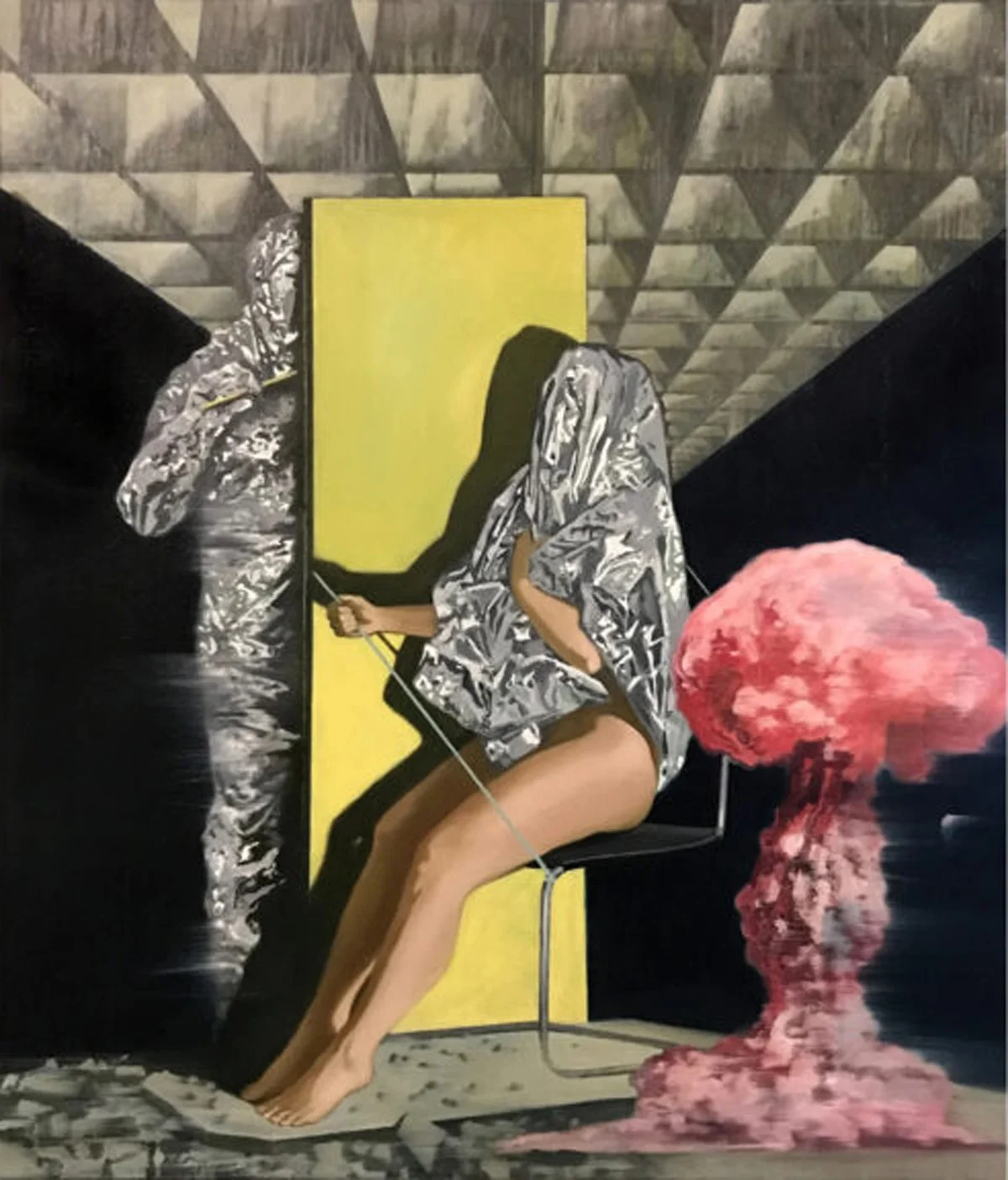 Одна из универсальных тревог, вновь актуальных в последние несколько лет, вызвана угрозой ядерного взрыва и Третьей мировой войны. Так, в работе «Силуэт» художника, известного под творческим псевдонимом Igor Ost, появляется розовый ядерный гриб, пока еще относительно небольшой, но намекающий на неизбежность глобальной катастрофы. Художник и натурщица, облаченные в одежду из фольги, пытаются как бы закрыться от внешнего мира, но довольно очевидно, что их попытки тщетны, а сами они обречены. Картина явным образом вдохновлена сюрреалистической эстетикой Сальвадора Дали и Рене Магритта, поэтому изображение ядерного взрыва ощущается здесь скорее не как конкретная угроза для человечества (как, скажем, в фильме «Оппенгеймер»), а как метафора разрушающегося мира. Не исключено, что в картине можно усмотреть и довольно горькую самоиронию художника: заниматься живописью на фоне происходящей катастрофы можно, только закрыв глаза и лицо.