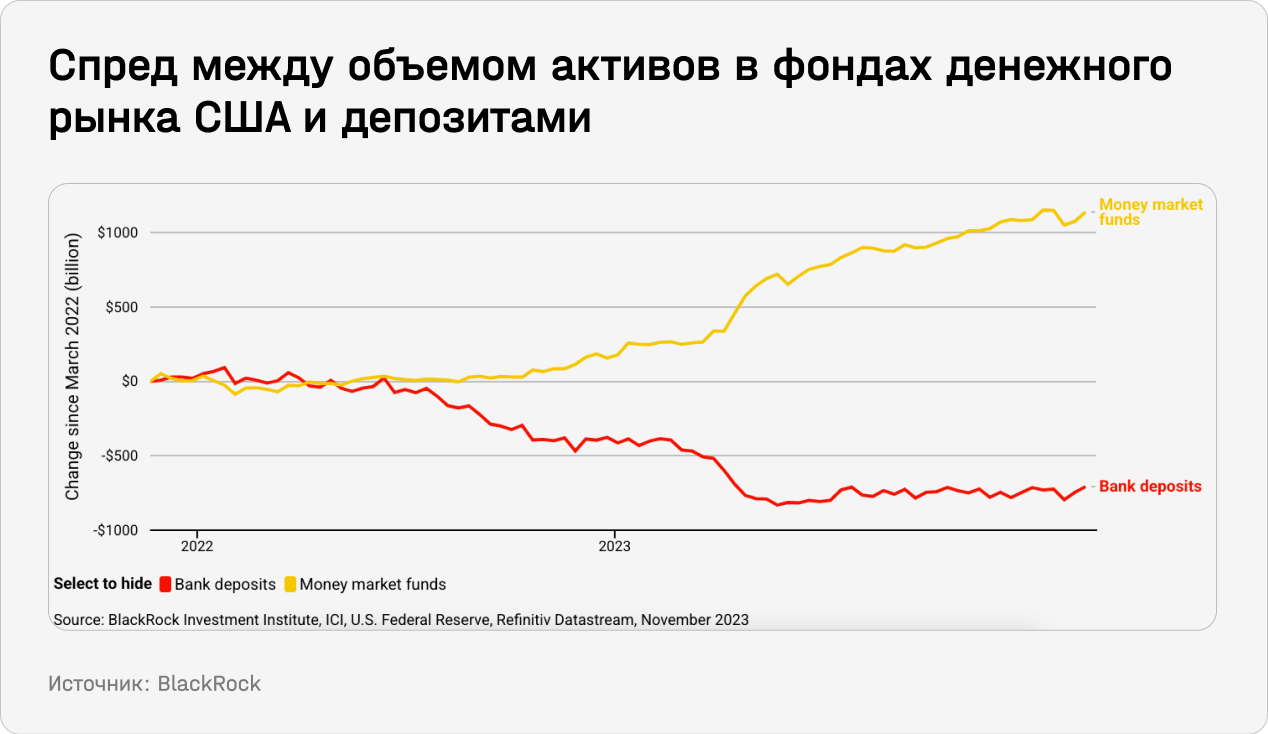Аналитики Goldman Sachs (GS) в своем последнем отчете по рынкам капитала, который есть у The Bell, пишут о перетоке капитала из банковских депозитов в активы фондов денежного рынка США (money-market funds, MMF). BlackRock сигнализировал о такой перестановке сил еще в конце 2023 года. И судя по последней динамике этих двух инструментов, разрыв между ними увеличился.