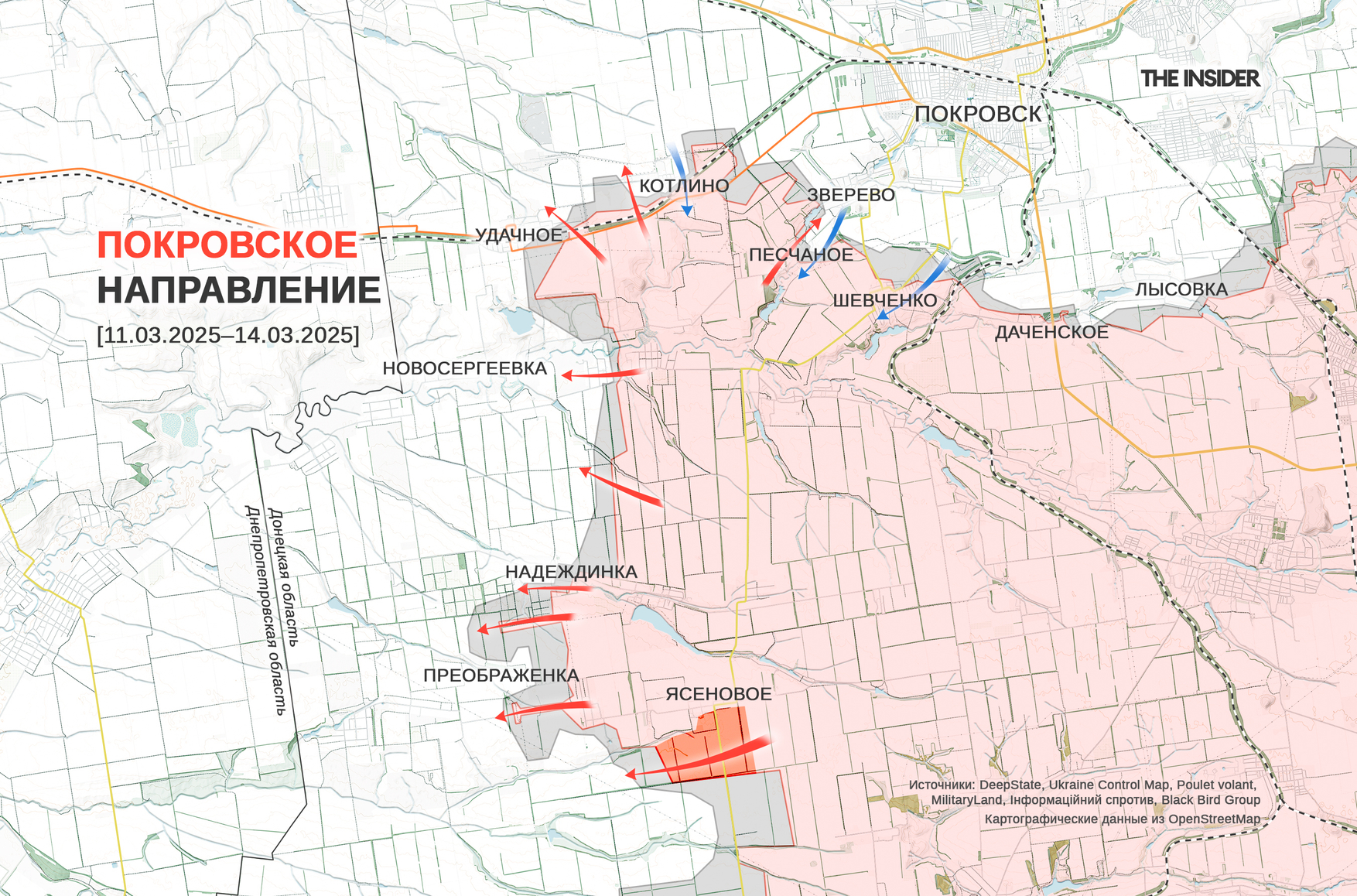 «Военкор» Котенок подтверждает потерю примерно половины Шевченко, а кроме того, сообщает о встречных боях к западу от Покровска на рубеже Удачного и Котлина (до 2016 года — Димитрово).