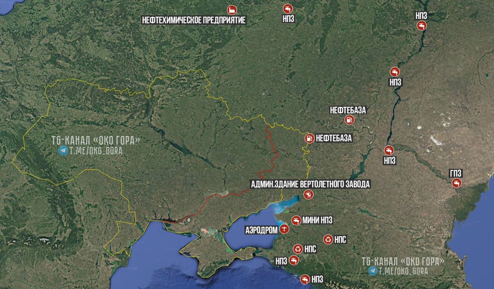 Украинский ресурс «Око Гора ✙ Новости и аналитика» опубликовал карту зафиксированных прилетов (всего их 15) украинских средств поражения по территории России за февраль 2025 года.