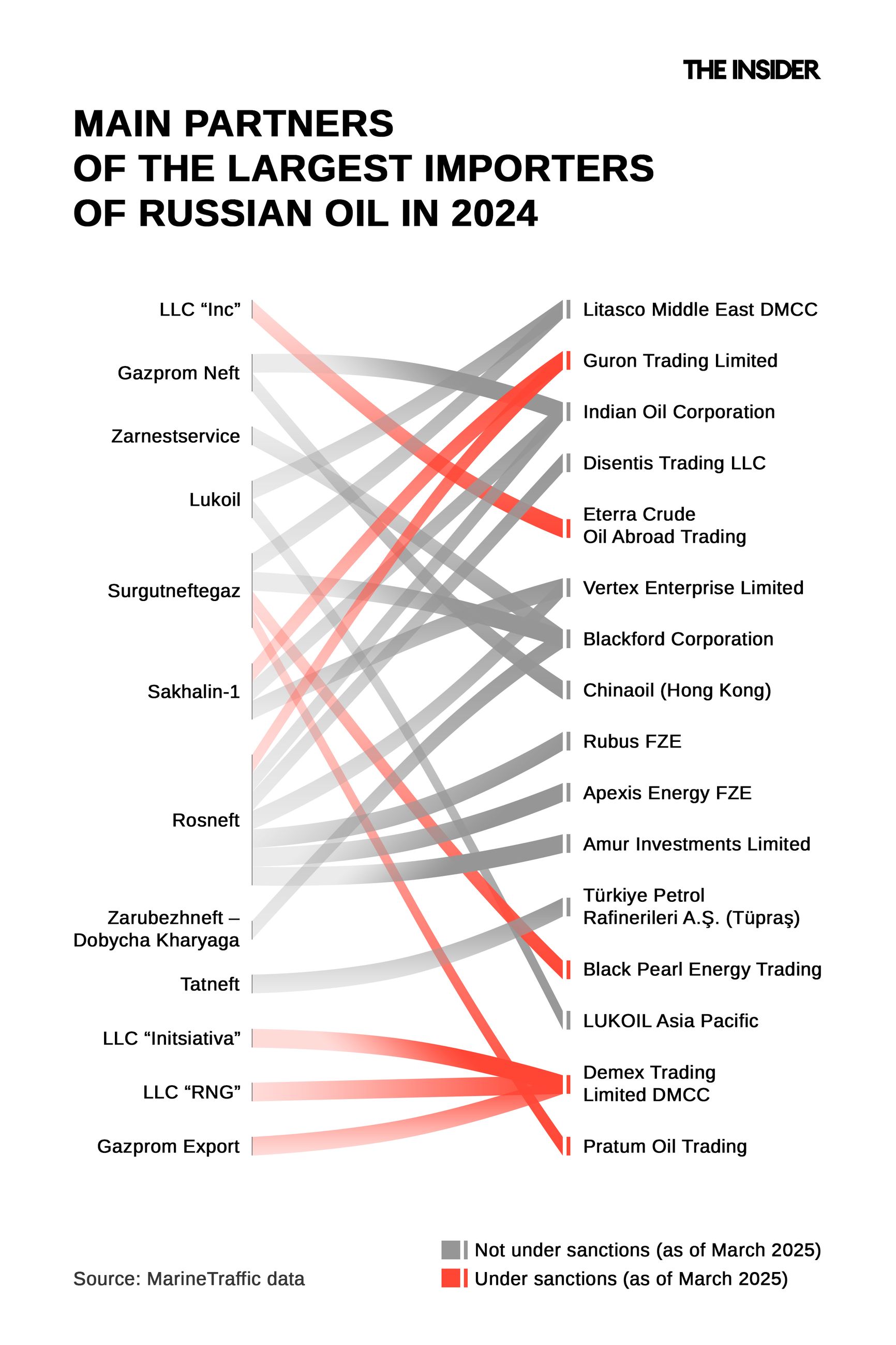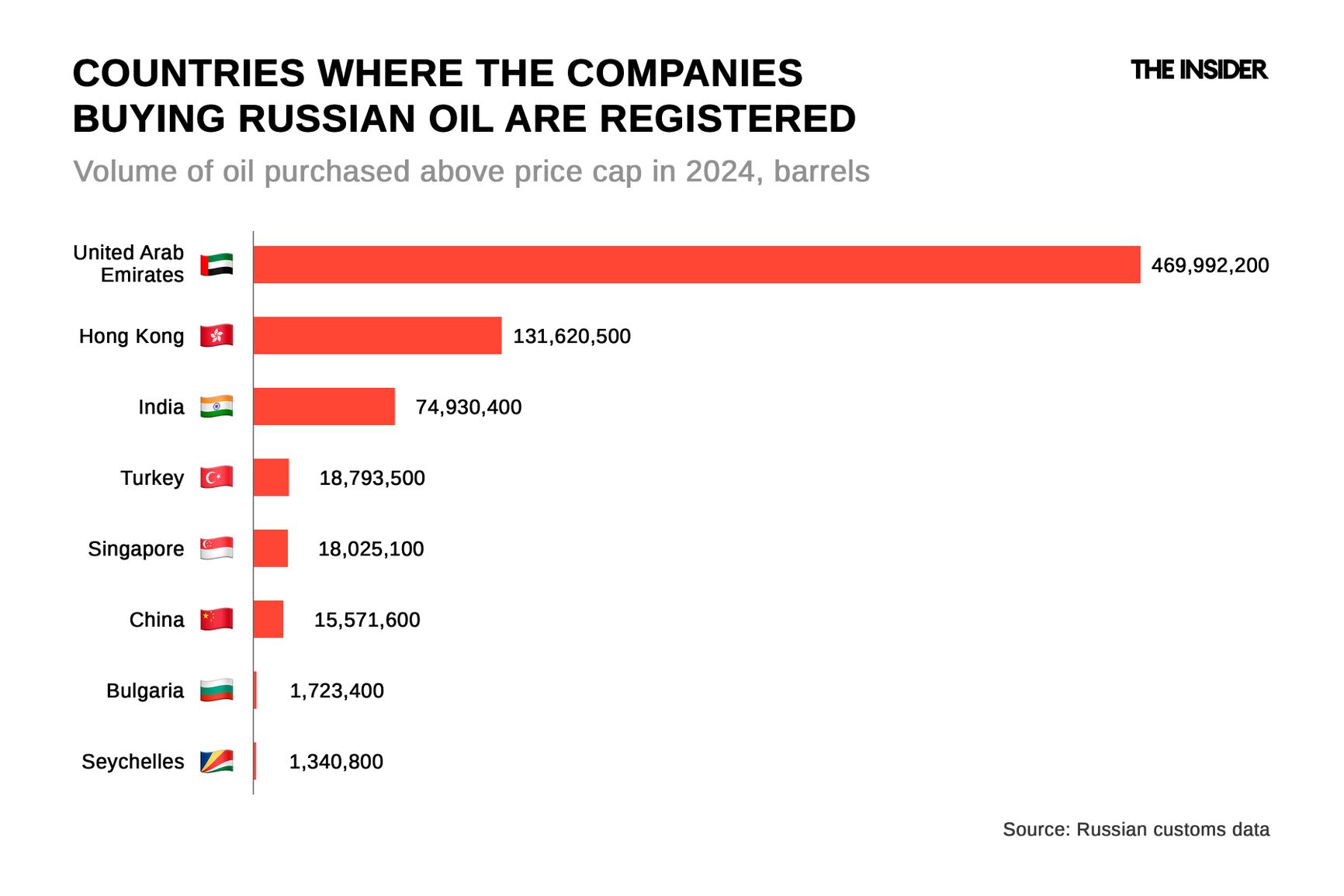 Vertex Enterprise Limited, which is linked to the previously mentioned Michael Kyprianou, purchased 35 million barrels of above-cap oil in 2024, placing it sixth in the ranking. In seventh place is Hong Kong’s Blackford Corporation Limited, the only known director of which is Sajid Manzoor. There is no information in the registers about the Dubai-based company Rubus FZE, which bought 19 million barrels of above-cap oil and ranked ninth. The managers of Dubai’s Apexis Energy FZE (tenth place) also remain a mystery; its shareholders were previously someone named Aysel Demirkaya, and since January 2024, Tulkinjon Turgunov. Amur Investments Limited, which bought similar volumes of above-cap oil, also has no known beneficiaries or managers. In total, fairly large importers under the control of unknown beneficiaries — Vertex, Blackford, Rubus, Apexis Energy, Amur Investments — are not under sanctions.