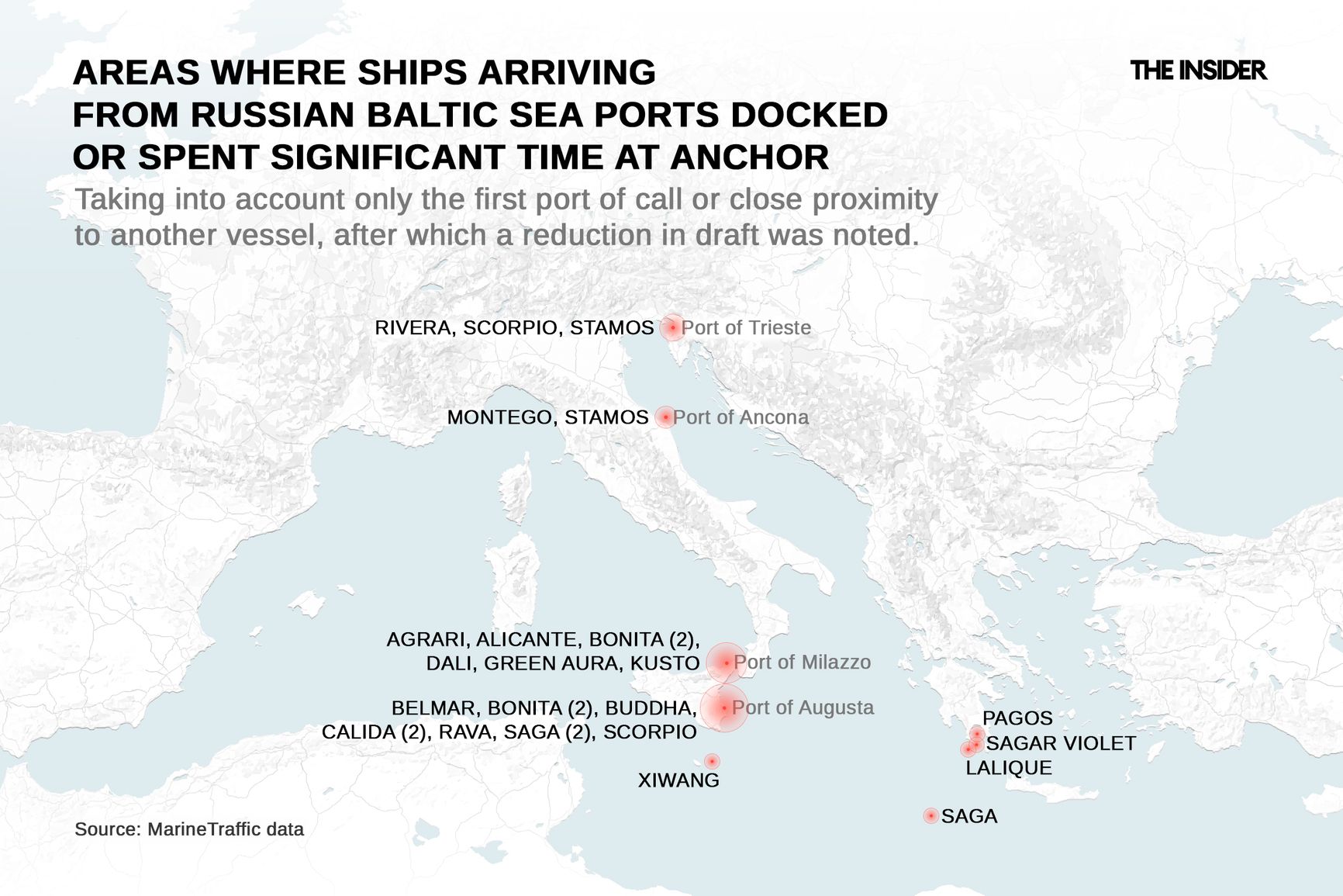 When a tanker unloads, its draft decreases, and changes in draft can be seen in the MarineTraffic system (although this data is not always complete and accurate). According to this system, at least 20 tankers that came from Russian oil ports in the Baltic Sea either visited or reduced their draft at or around Mediterranean ports last year, as calculated by The Insider. In addition to the Augusta port, ships have used the Sicilian port of Milazzo, as well as ports in Trieste and the waters near Malta. Many ships that passed by Italy continued sailing to the Bay of Laconia and sometimes also headed for Turkey and/or Alexandria. While a reduction in the draft of these tankers is not always visible in the database, the fact that the ships approached Italian ports suggests they unloaded oil there. Otherwise, there would be no reason for the vessels to waste time and money by docking, changing course, and remaining anchored.