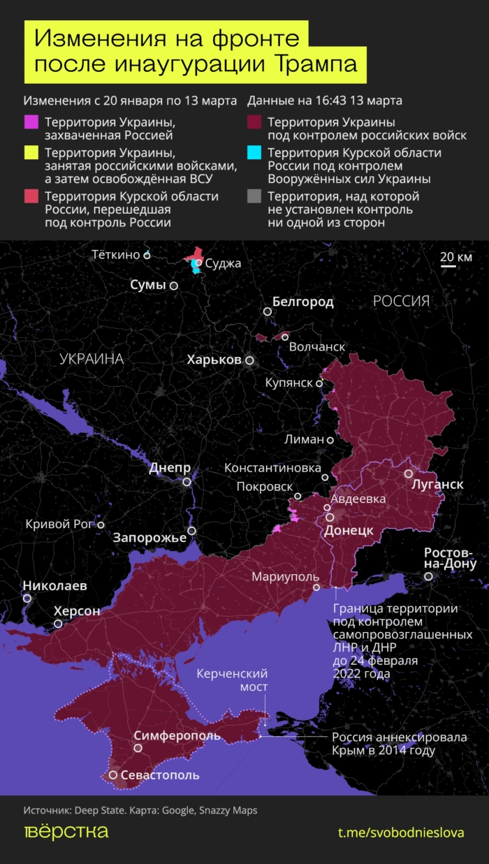 После инаугурации президента США Дональда Трампа, который обещал положить конец войне, армия России заняла как минимум 348 кв. км территории в Украине, подсчитала «Вёрстка» на основе данных OSINT-проекта Deepstate.