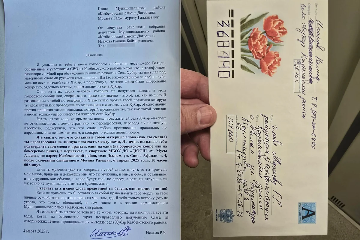 Апогеем конфликта стал вызов на бой, который Рашид Исаков направил главе района Гаджимураду Мусаеву. Депутат по почте отправил чиновнику письмо. В нем он объяснил, что слова Мусаева он воспринимает как личное унижение, но при этом убежден, что они были направлены и на всех сельчан.