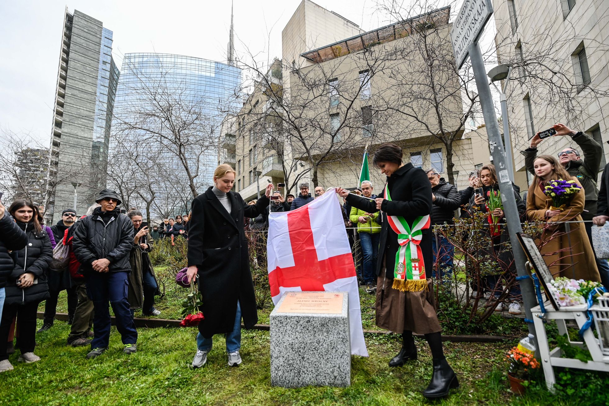 В церемонии открытия мемориала приняли участие глава городского совета Милана Елена Бушеми и дочь Алексея Навального, Дарья Навальная.