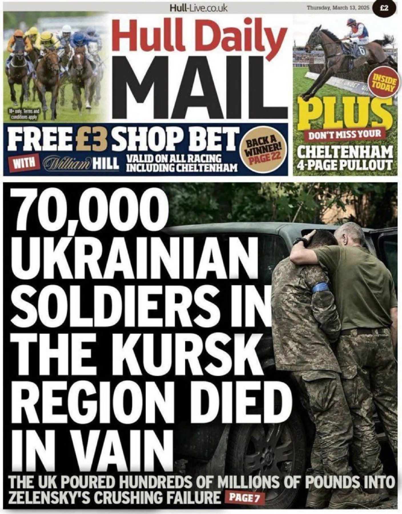 Тем временем в соцсетях распространяется еще один фейк о ВСУ в Курской области. Блогер Борис Рожин, он же Полковник Кассад, опубликовал фотографию первой полосы британской региональной газеты Hull Daily Mail с заголовком: «70 000 украинских солдат в Курской области погибли напрасно».