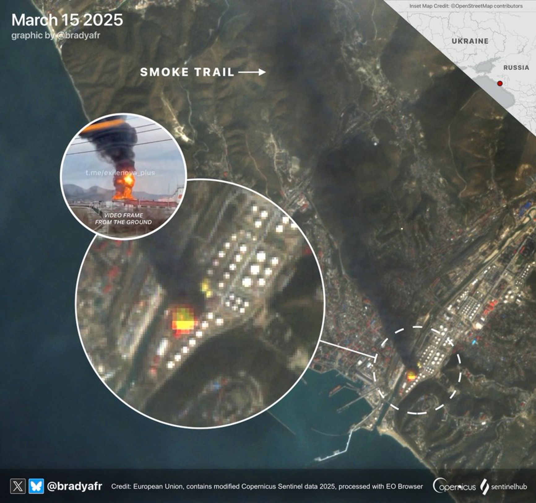 Глава Туапсинского муниципального округа Сергей Бойко сообщил утром 17 марта, что пожар в резервуарном парке Туапсинского НПЗ полностью ликвидирован. Исследователь Брэди Африк опубликовал спутниковый снимок, на котором хорошо виден пожар на территории предприятия.