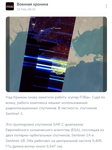 Детали. Одним из первых о «Супер-РЭБ» в Крыму сообщил крупный пророссийский провоенный телеграм-канал «Военная хроника» 15 февраля. По его данным, из-за этой системы спутник Европейского космического агентства Sentinel-1 накануне сделал засвеченные снимки полуострова. Третьего марта тему подхватил агрегатор новостей «СМИ2». Проект, созданный, чтобы собирать новости других изданий, неожиданно сам написал текст.