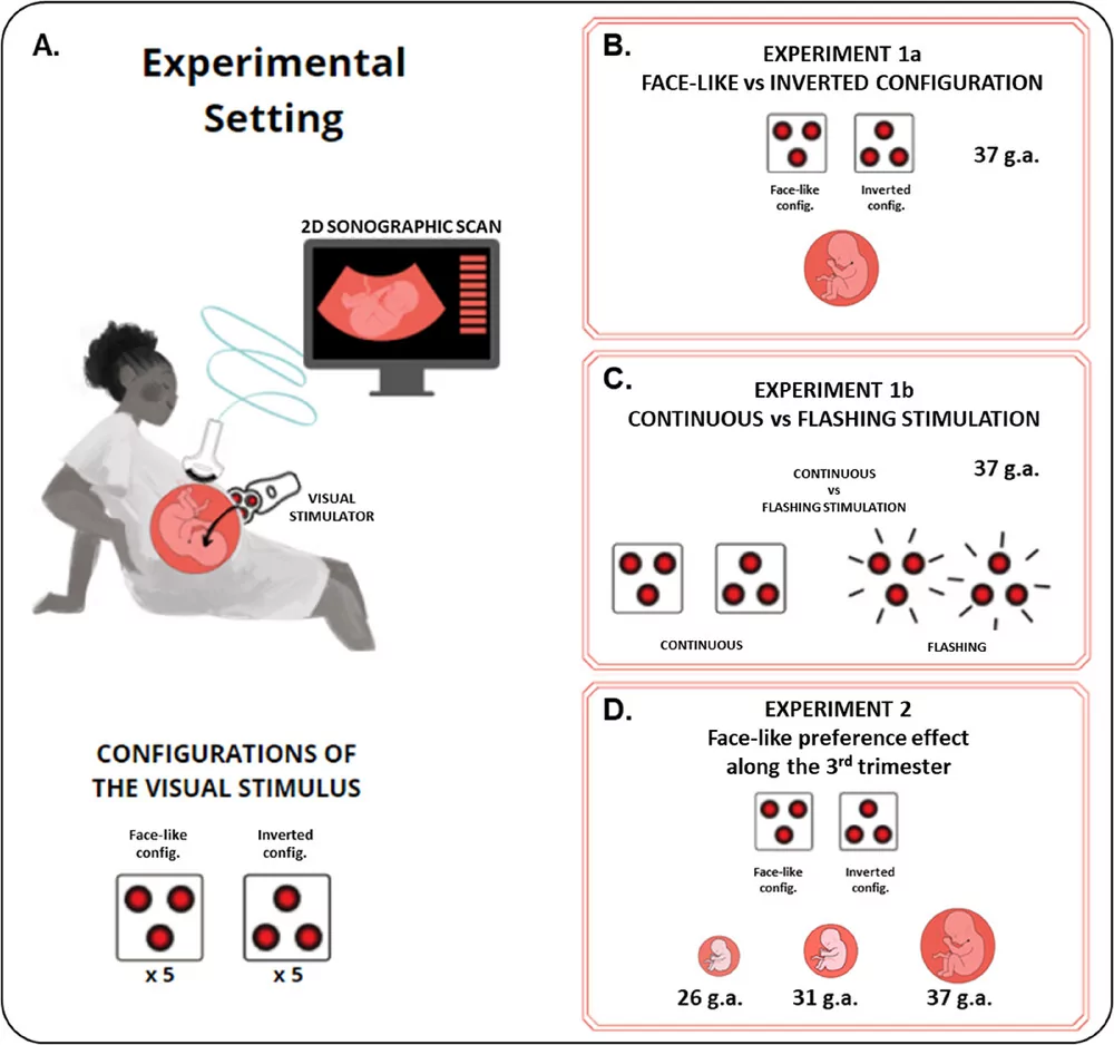 Чтобы имитировать человеческое лицо, ученые поворачивали треугольник двумя вершинами вверх, чтобы они были похожи на два глаза и рот. Также ученые показывали детям «перевернутое лицо» — треугольник, стоящий на одной из своих сторон. Оказалось, что дети в утробе матери чаще поворачивают голову в сторону конфигурации, похожей на лицо, а на перевернутый треугольник — почти не обращают внимания.. Это позволило ученым предположить, что способность грудных детей различать лица формируется еще до рождения.
